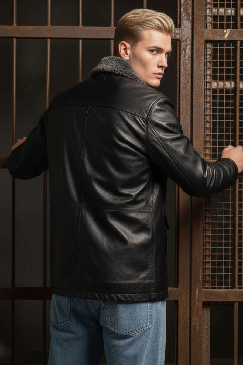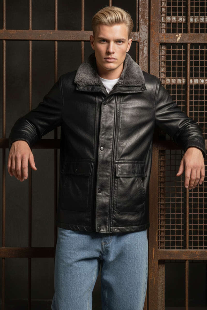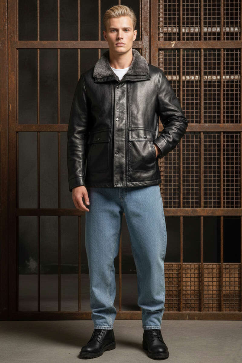 Fermuarlı Cepli Yaka Kürklü Erkek Deri Mont Siyah