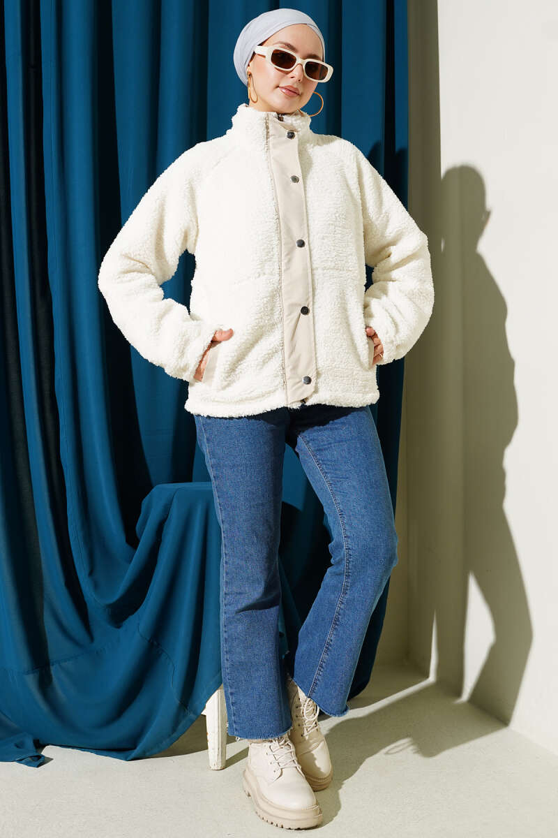 Kruvaze Yaka Kürklü Mont Bej