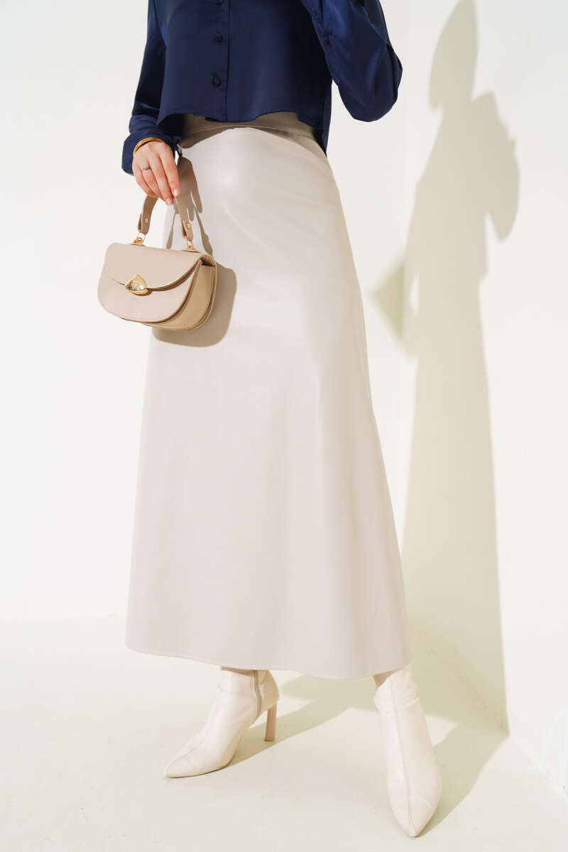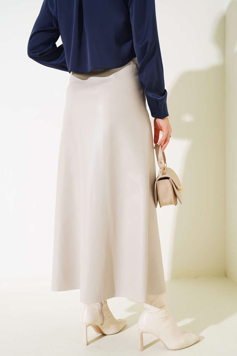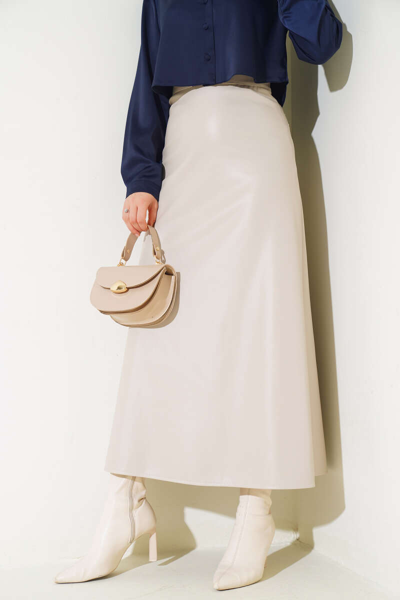 Fermuarlı Deri Kloş Etek Bej