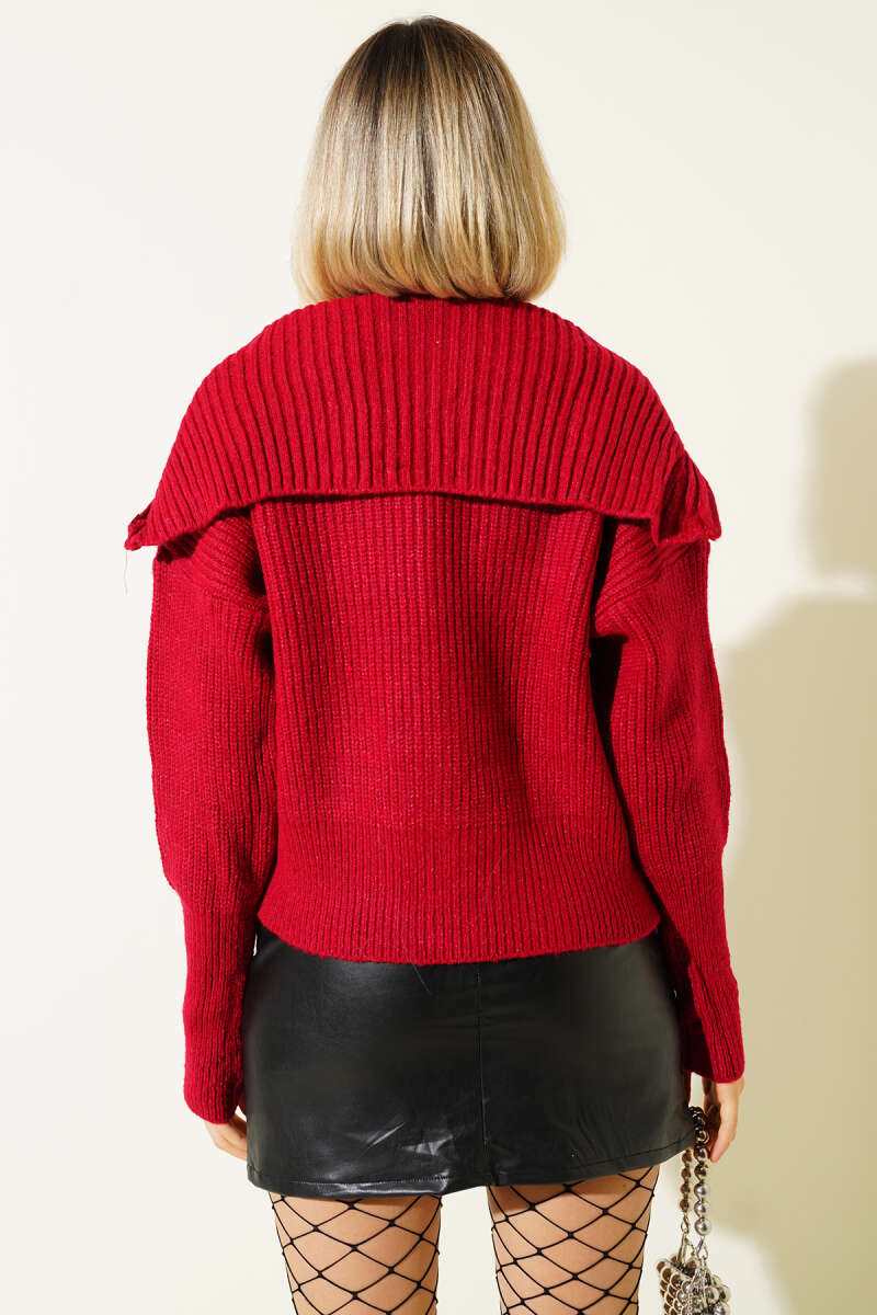 Fermuarlı Geniş Örgülü Hırka Kırmızı