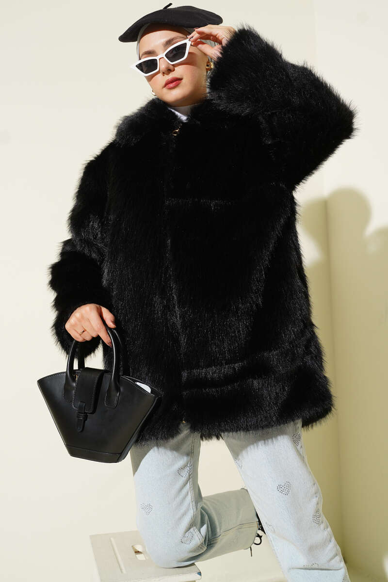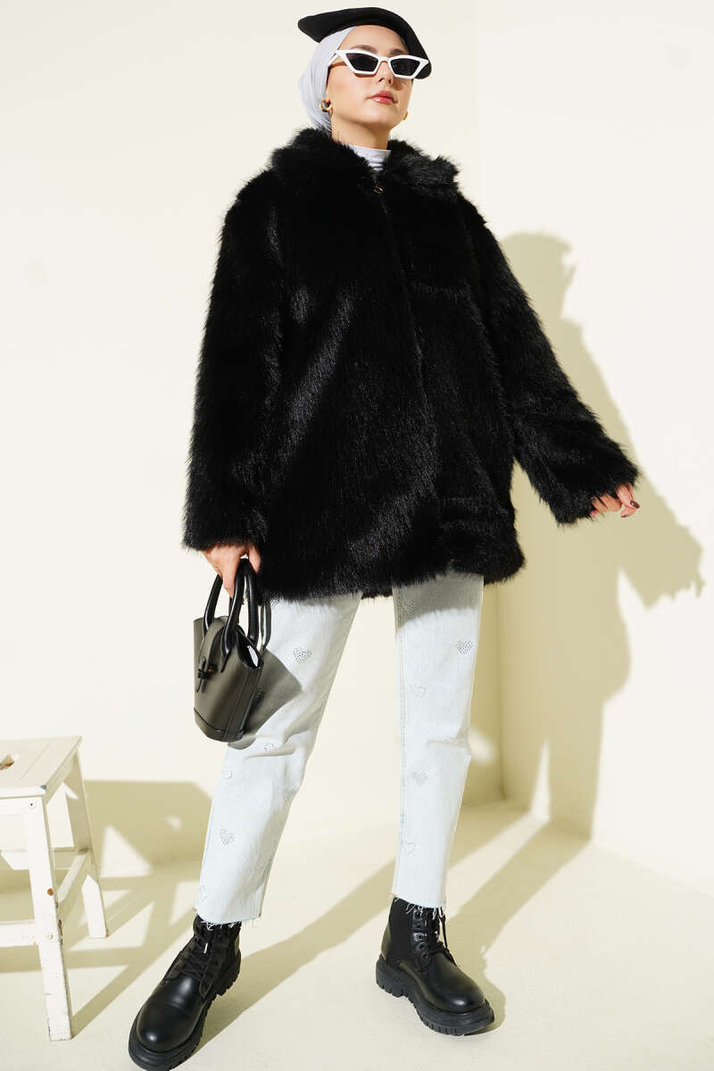 Fermuarlı Gömlek Yaka Kürk Mont Siyah