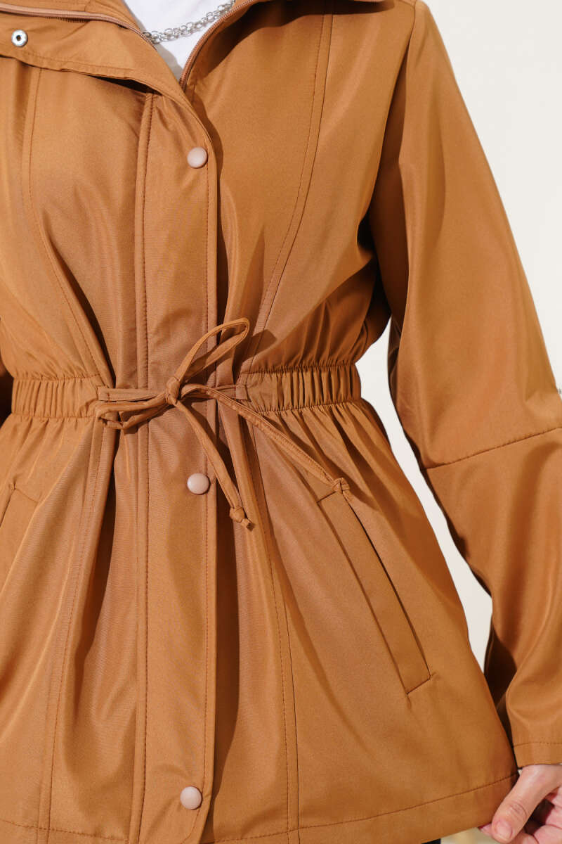 Fermuarlı Kapüşonlu Bel Lastikli Trençkot Taba