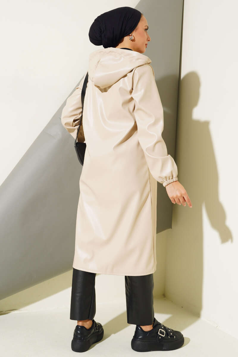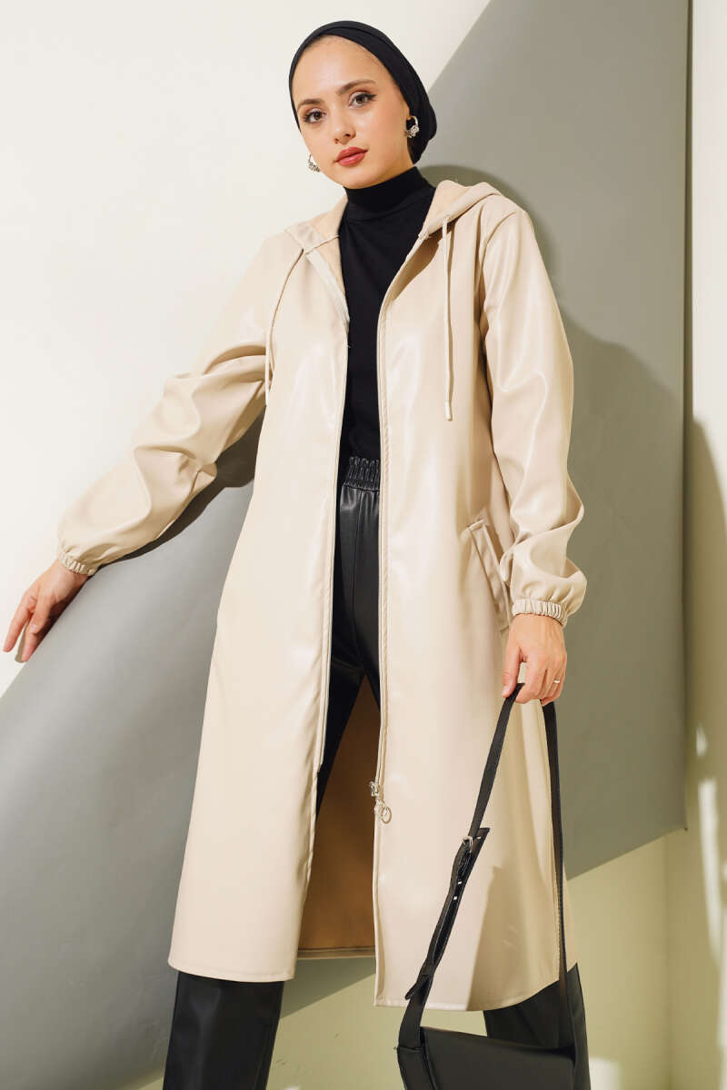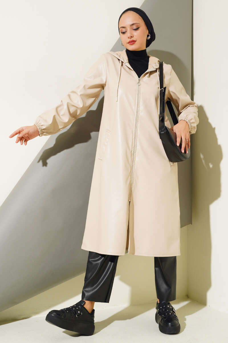 Fermuarlı Kapüşonlu Deri Kap Bej