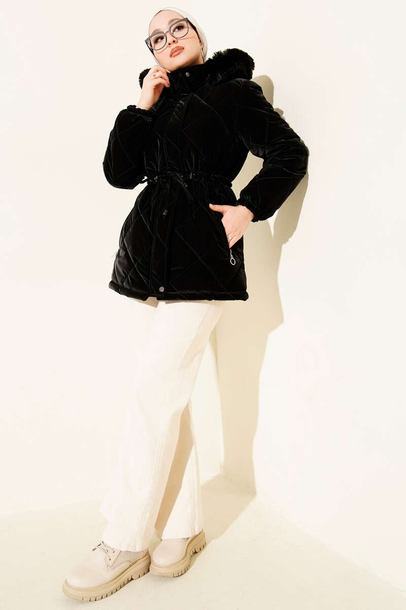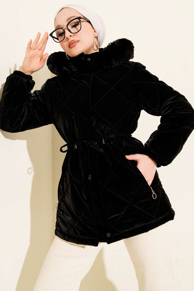 Baklava Desen Bel Tünelli Kapitone Mont Siyah