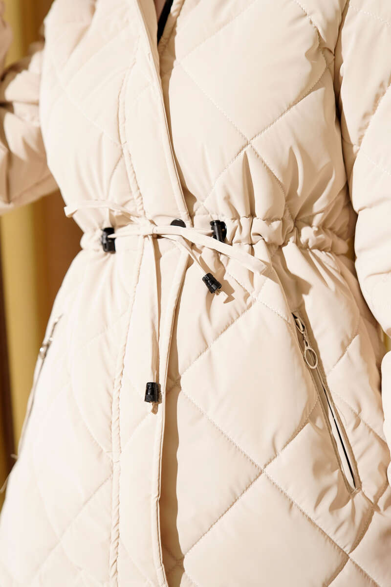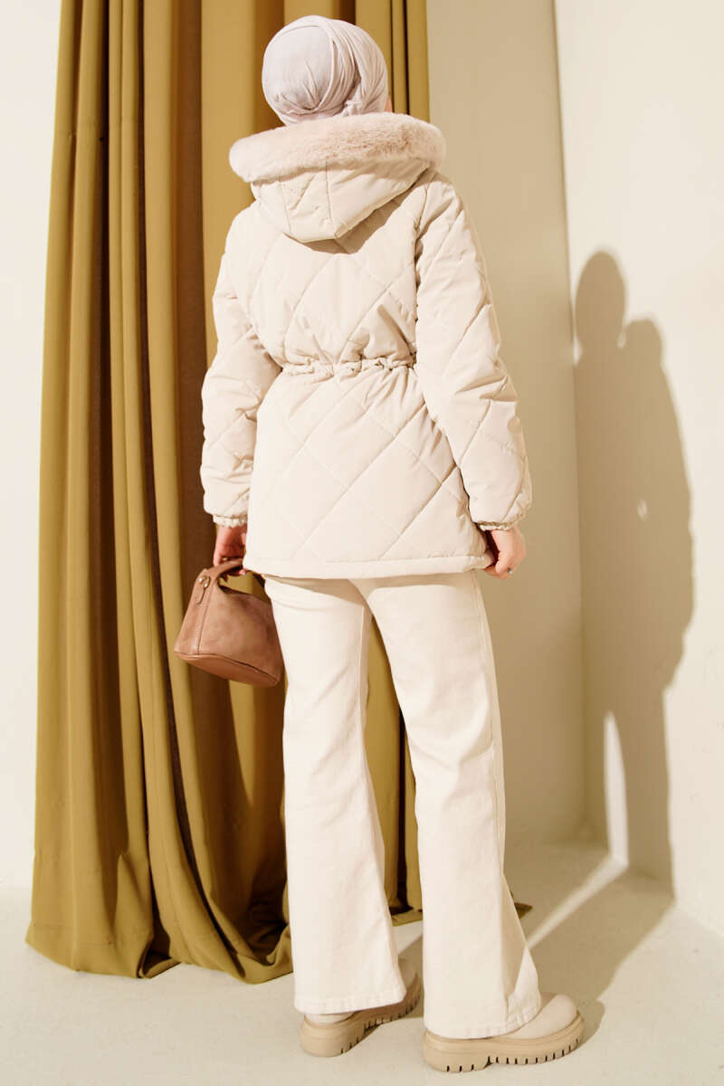 Yaka Kürklü Kapitone Kısa Mont Bej