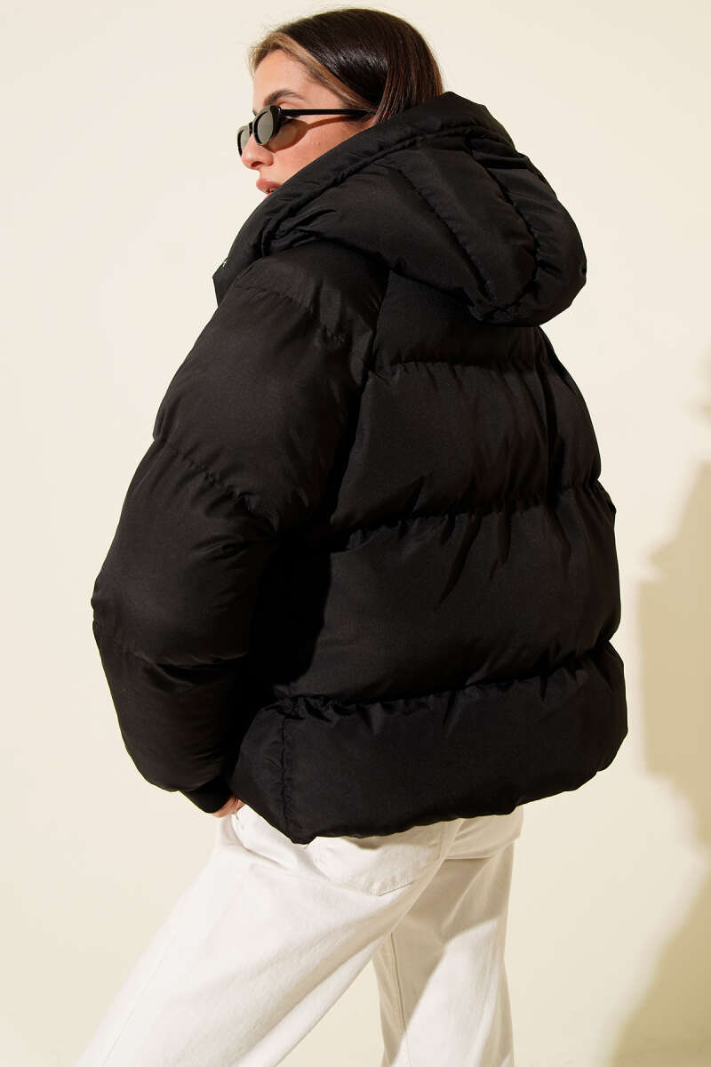 Fermuarlı Kapüşonlu Kısa Şişme Mont Siyah