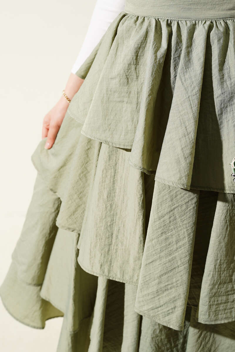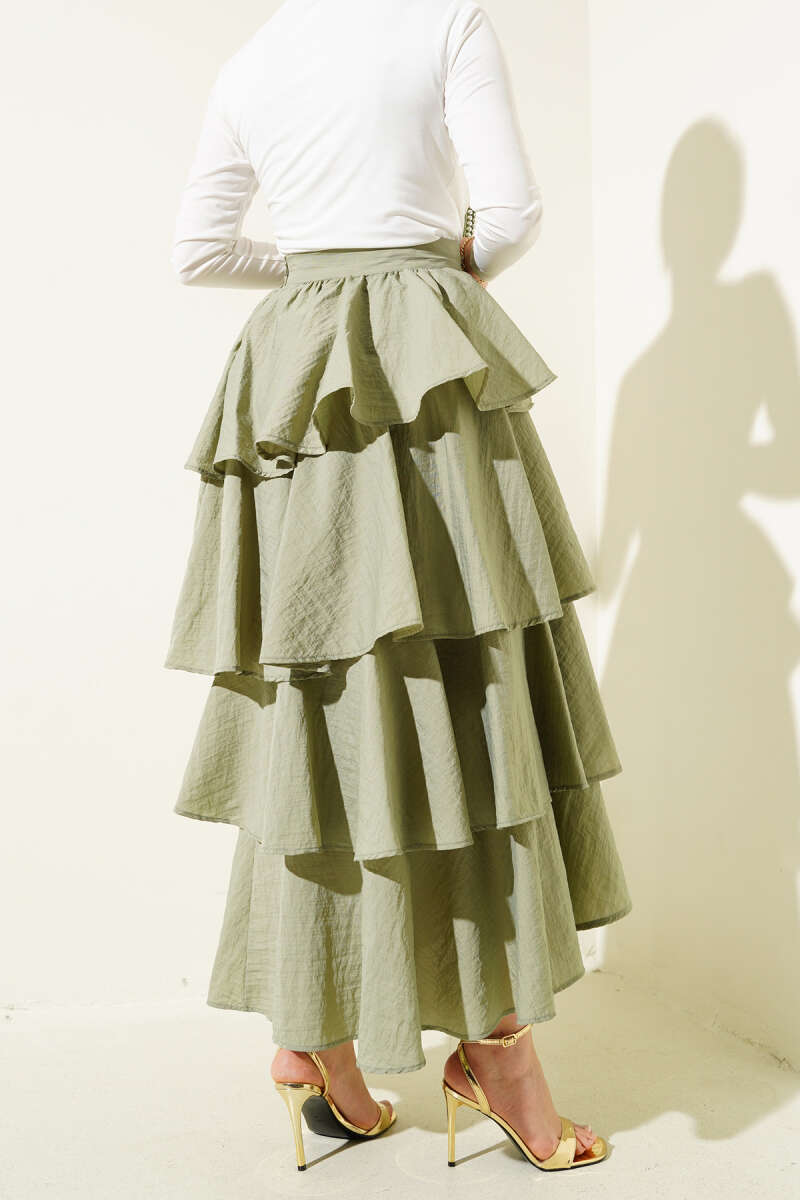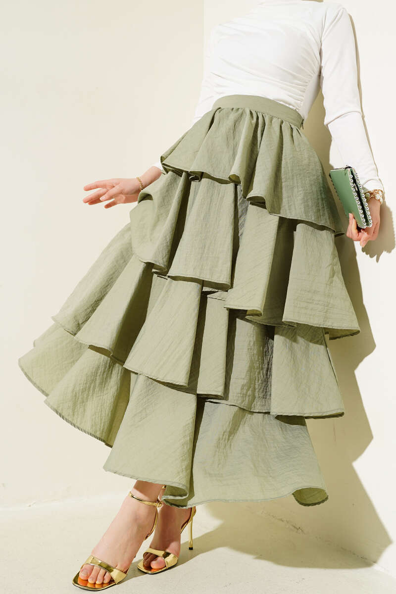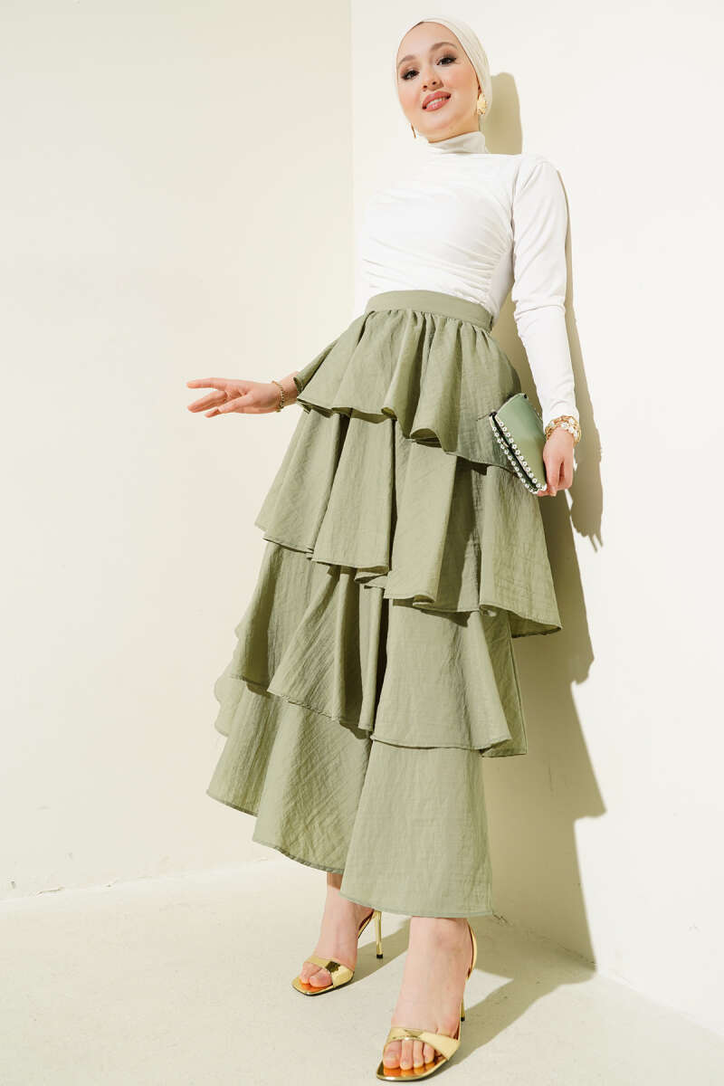Kemerli Çift Cepli Kloş Etek Haki