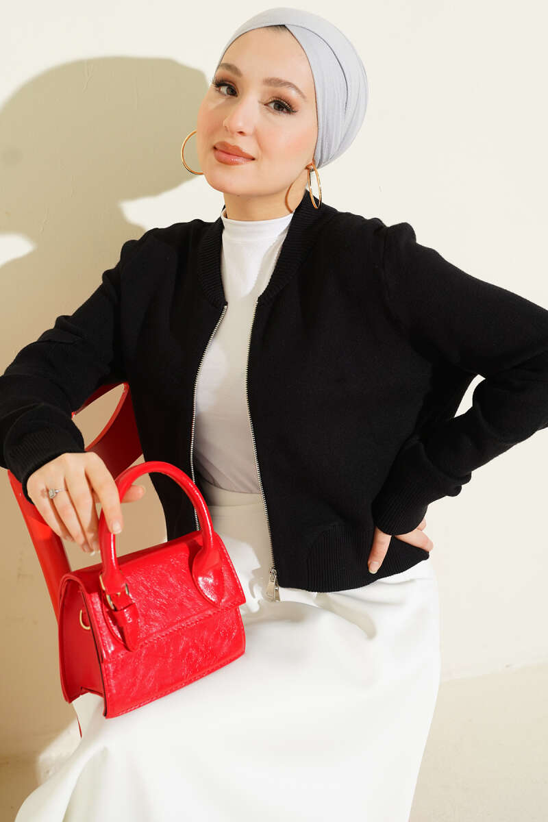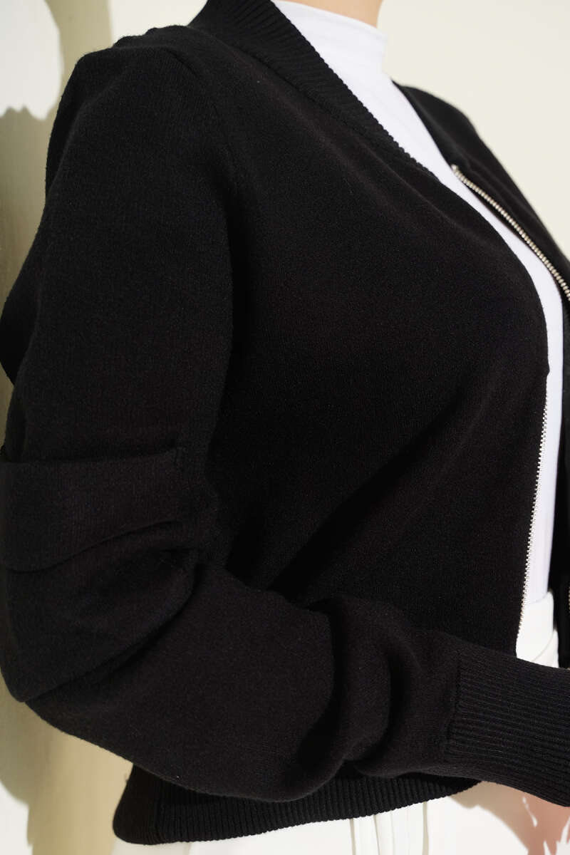 Cepli Çizgi Detaylı Triko Hırka Siyah