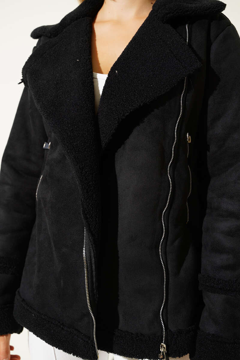 Kapüşonlu Fermuarlı Peluş Mont Pembe