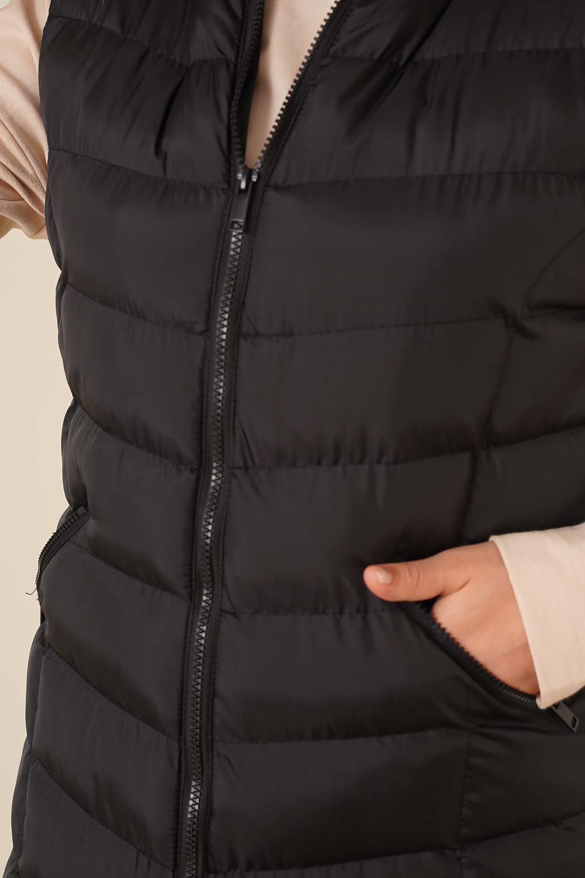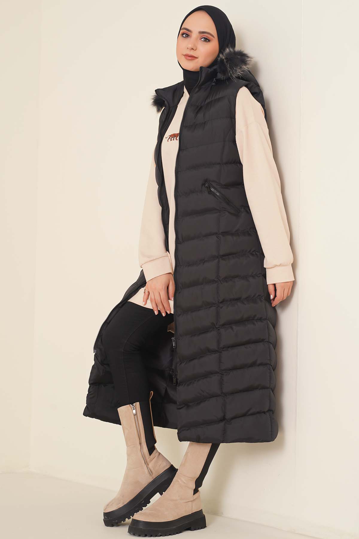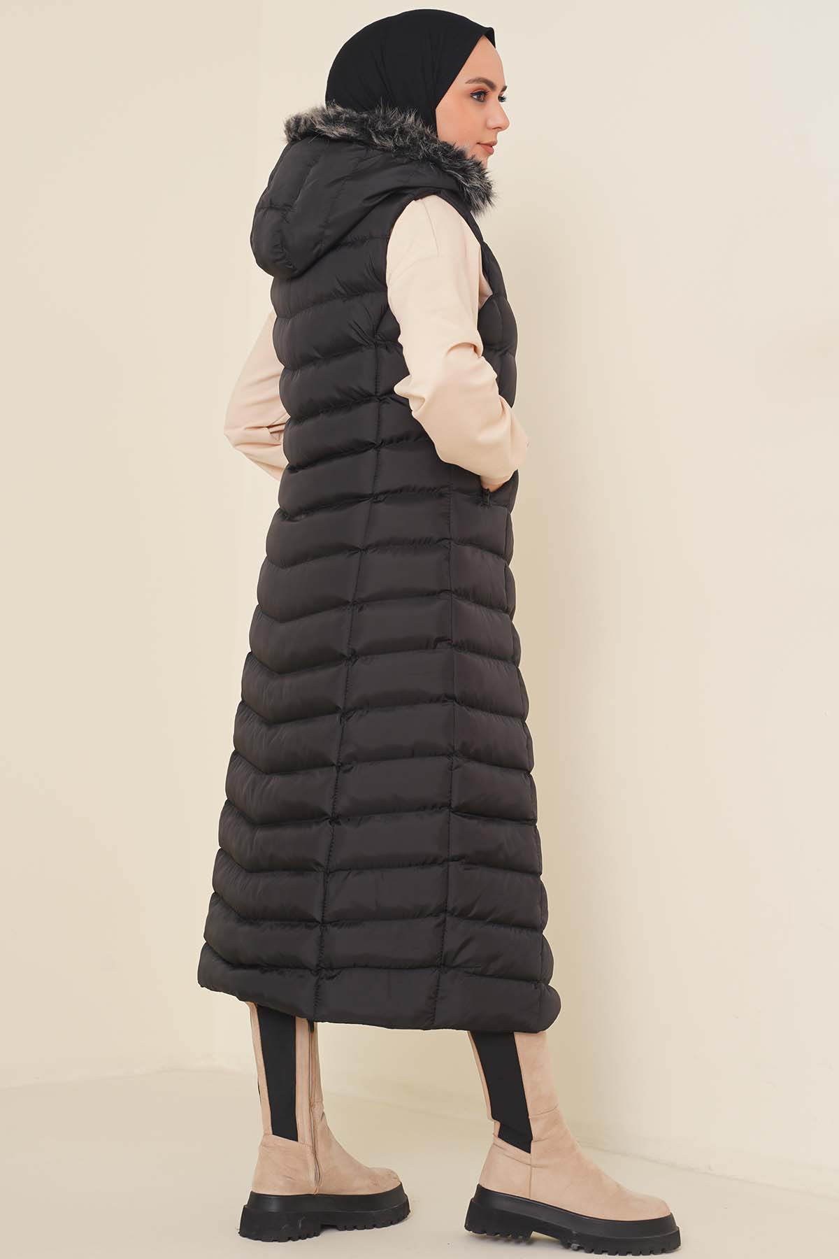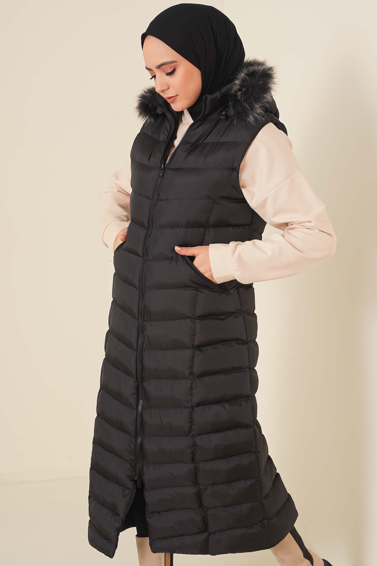 Yeni sezon model şişme yeleğimiz sade tasarımıyla sizlerle birlikte. Kürklü kapşonu vardır. İki cebi vardır. Cepleri fermuarlıdır. Serin havalarda her kıyafetinizin üzerine rahatlıkla giyebilirsiniz.
