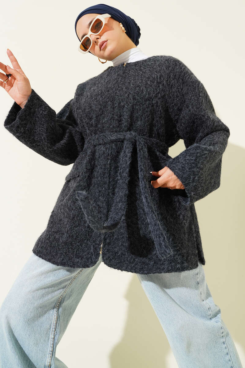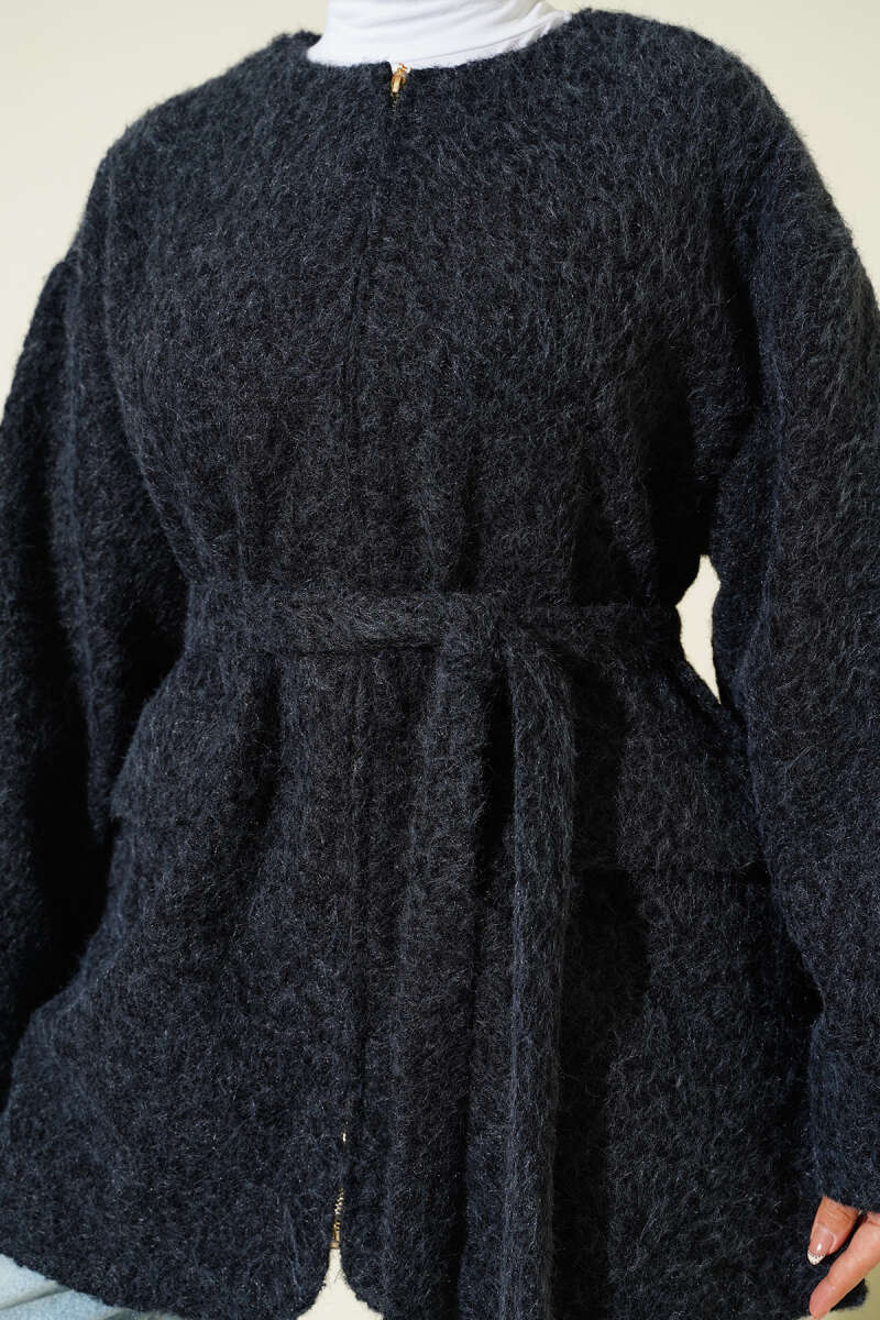 Fermuarlı Kuşaklı Keçe Ceket Gri