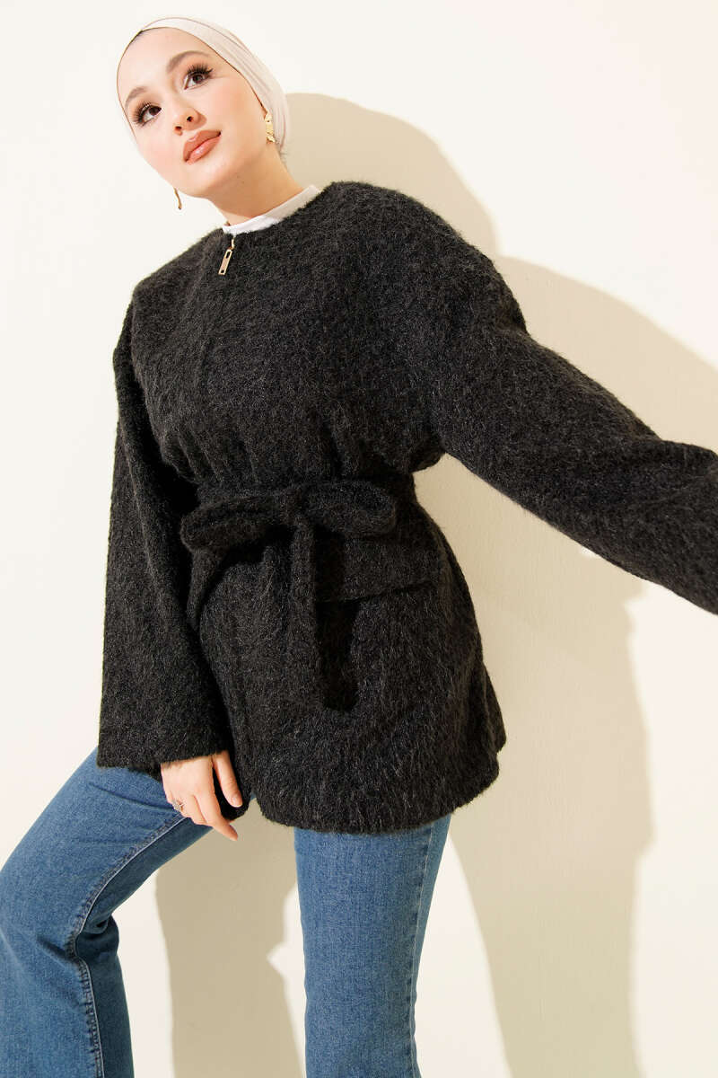 Fermuarlı Kuşaklı Keçe Ceket Taba