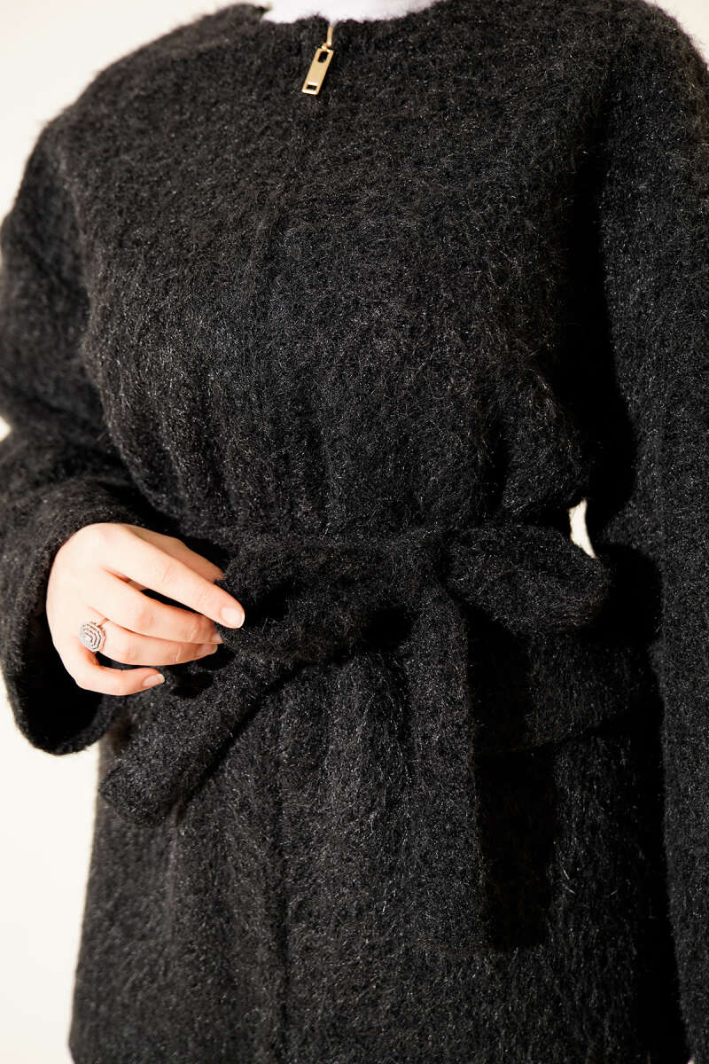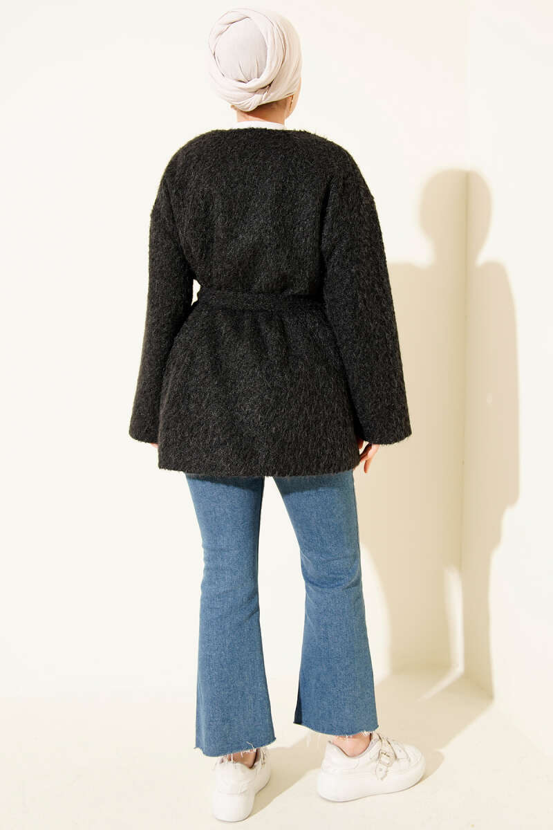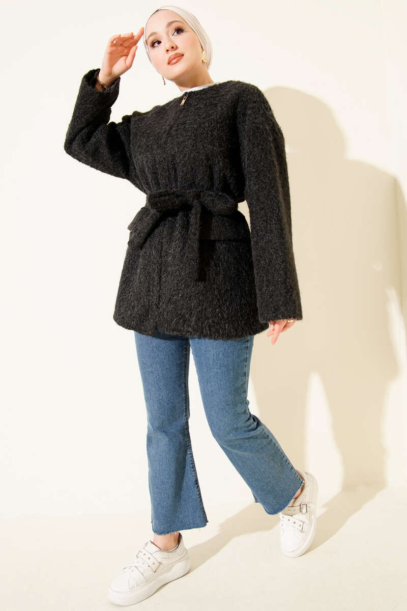 Bel Tünelli Çıtçıtlı Peluş Ceket Siyah