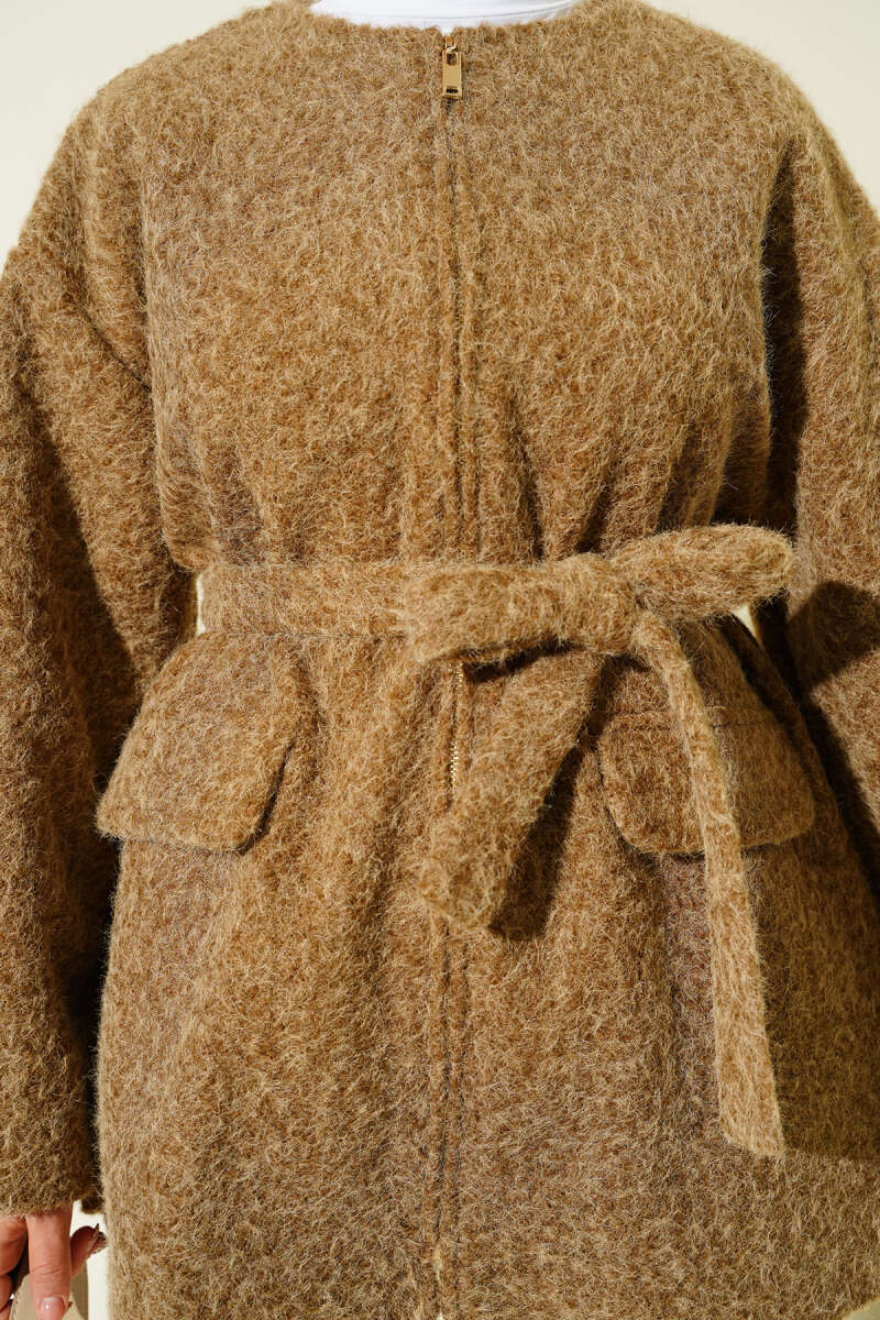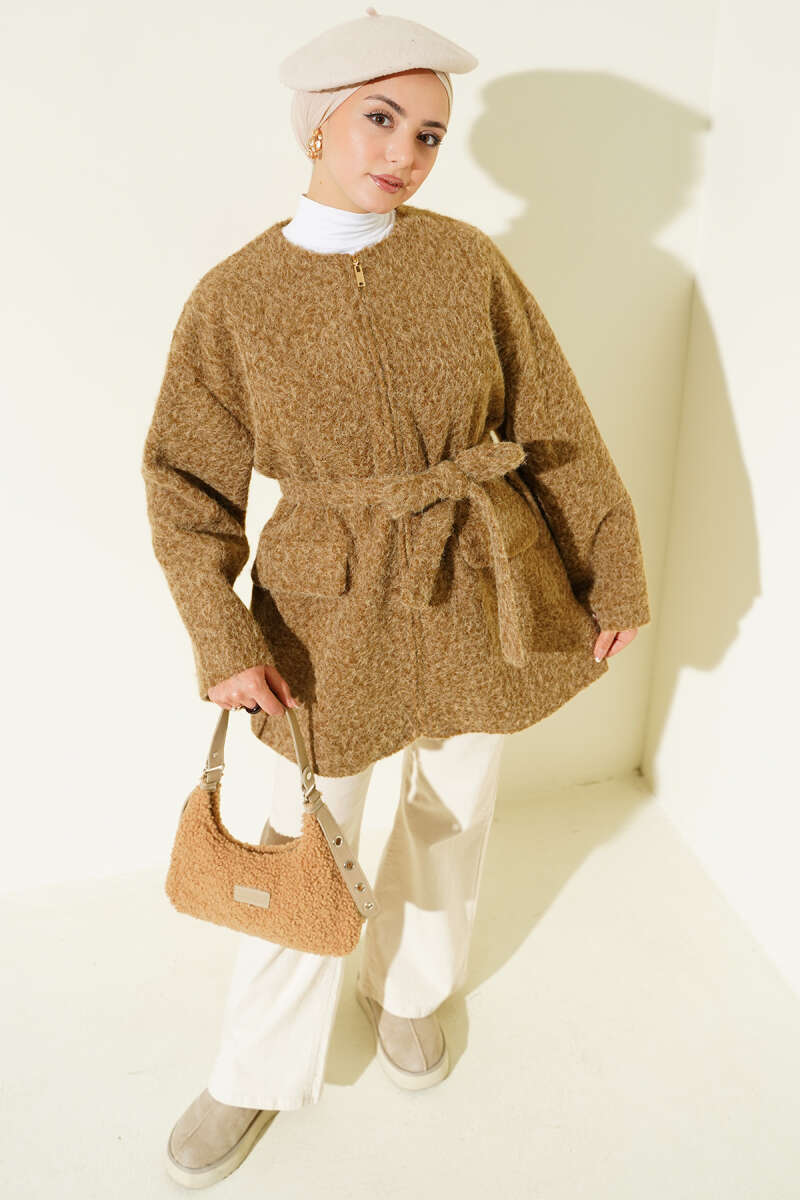 Fermuarlı Kuşaklı Keçe Ceket Taba