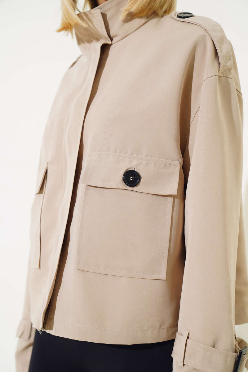 Gold Broşlu Cepli Kaşe Kaban Bej