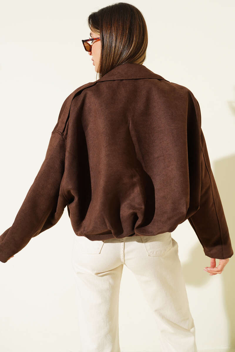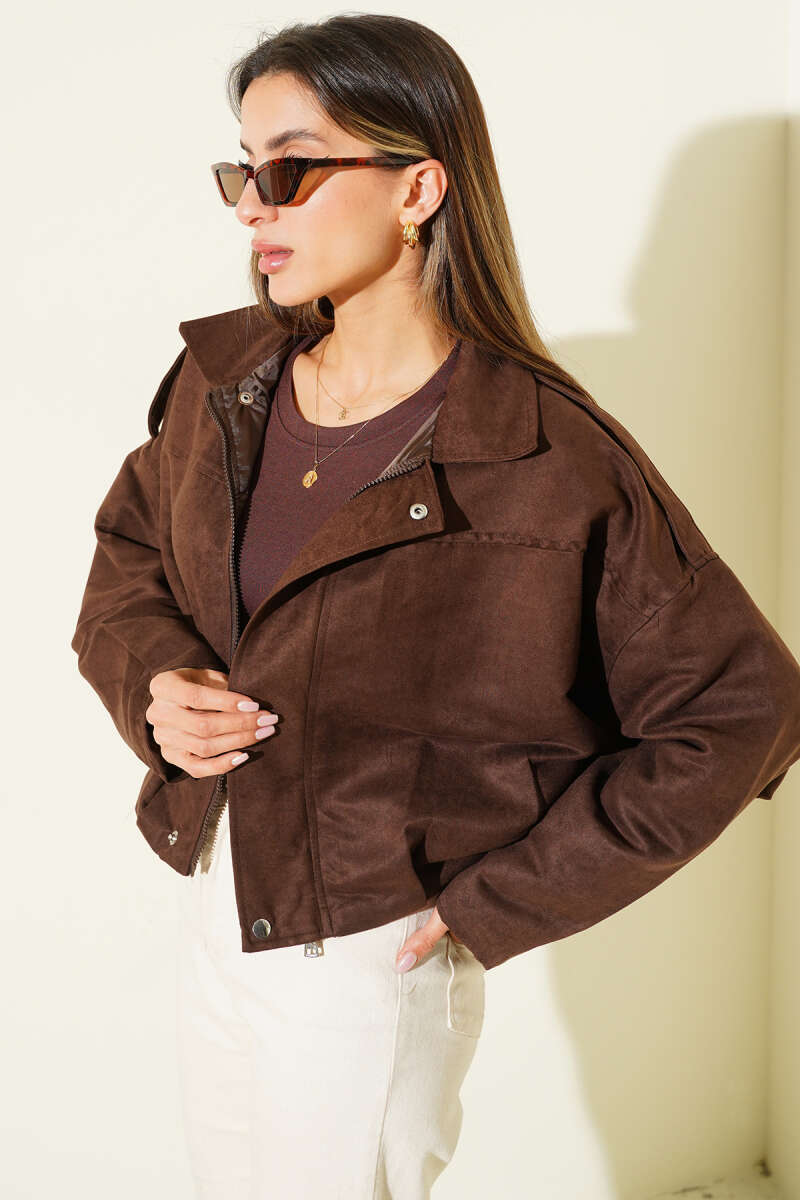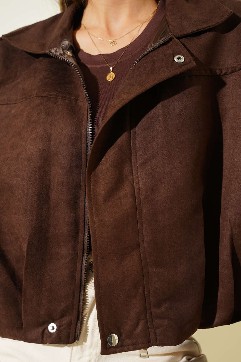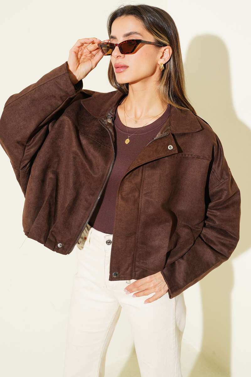 Fermuarlı Oversize Kısa Süet Ceket Taba