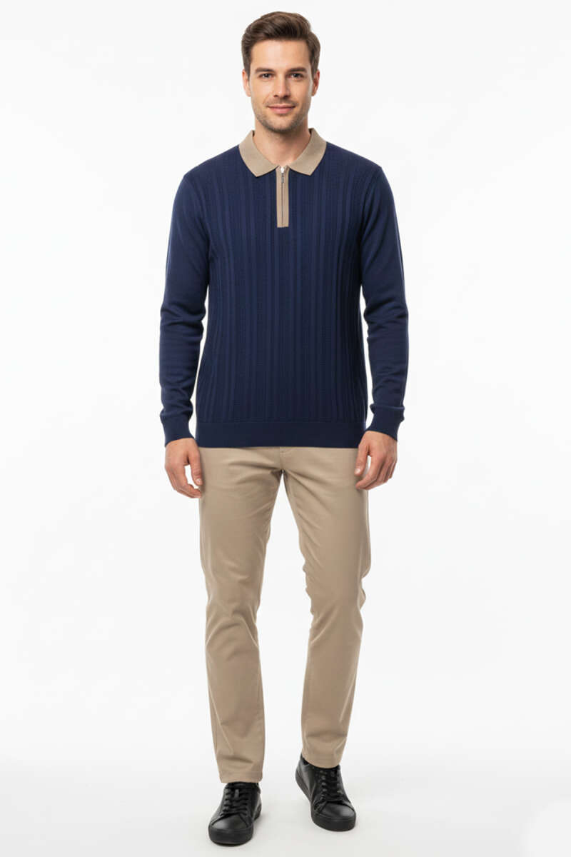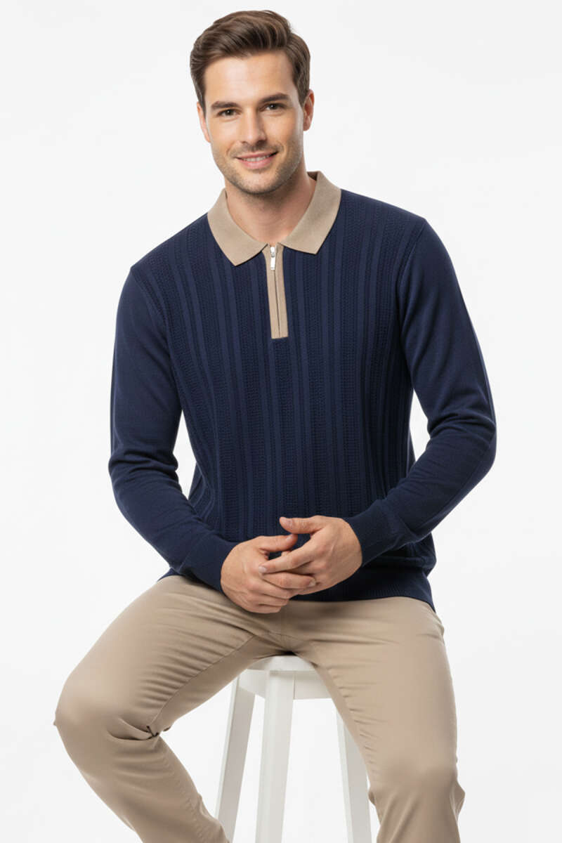 Fermuarlı Polo Yaka Örme Erkek Kazak Lacivert