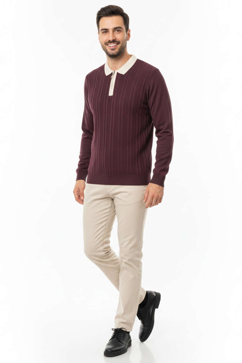 Fermuarlı Polo Yaka Örme Erkek Kazak Mürdüm