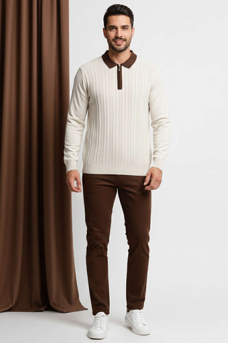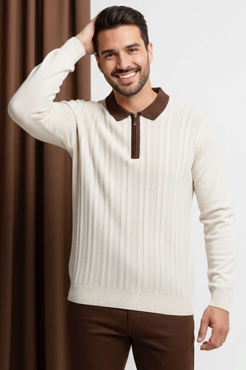 Fermuarlı Polo Yaka Örme Erkek Kazak Taş