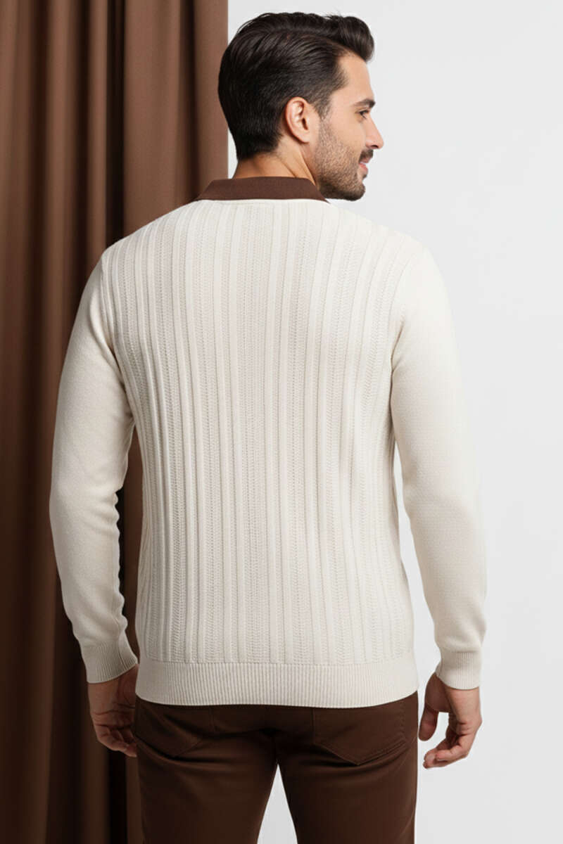 Zincir Desen Örme Triko Erkek Kazak Krem