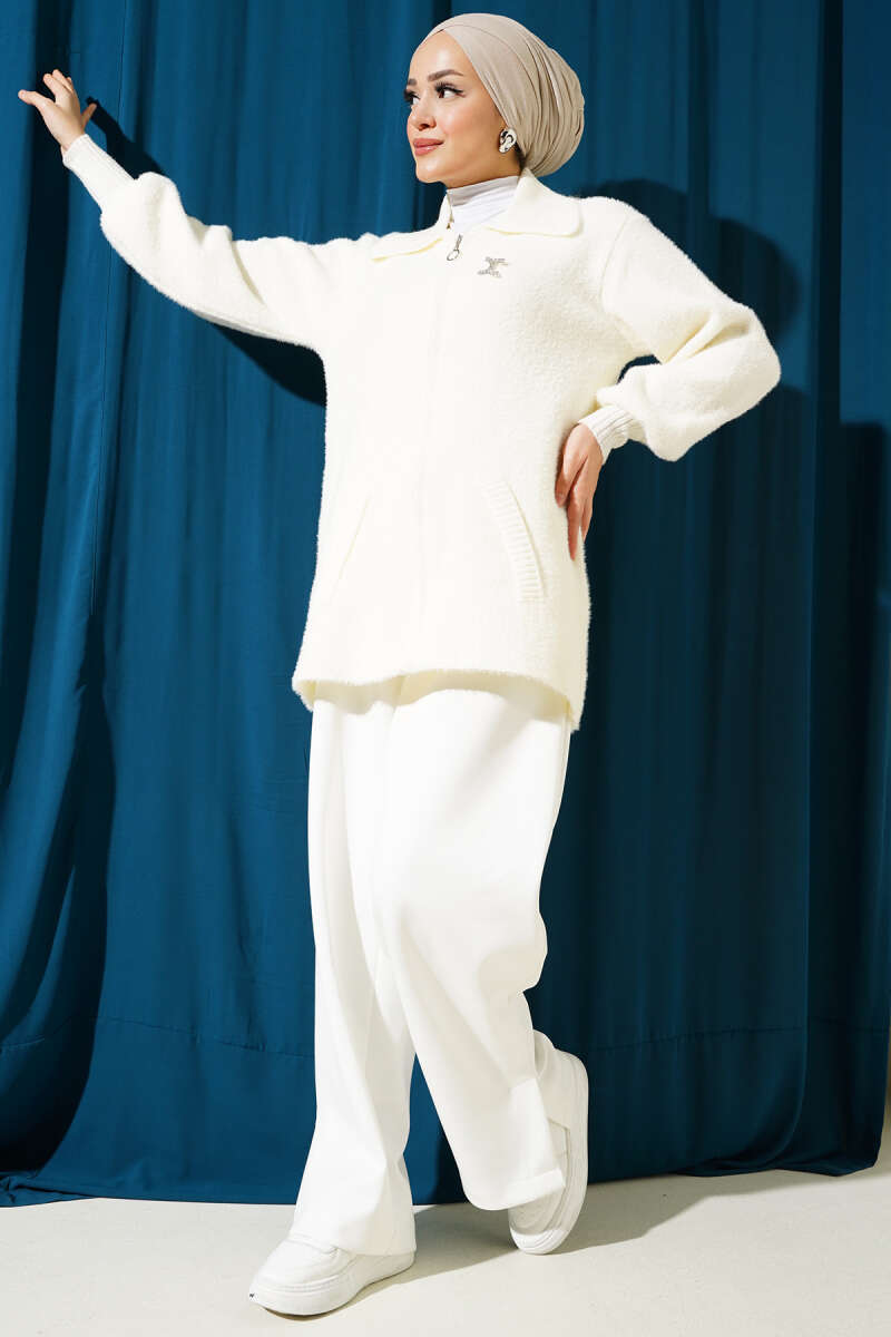 Yaka Dantelli Kısa Triko Hırka Kahve