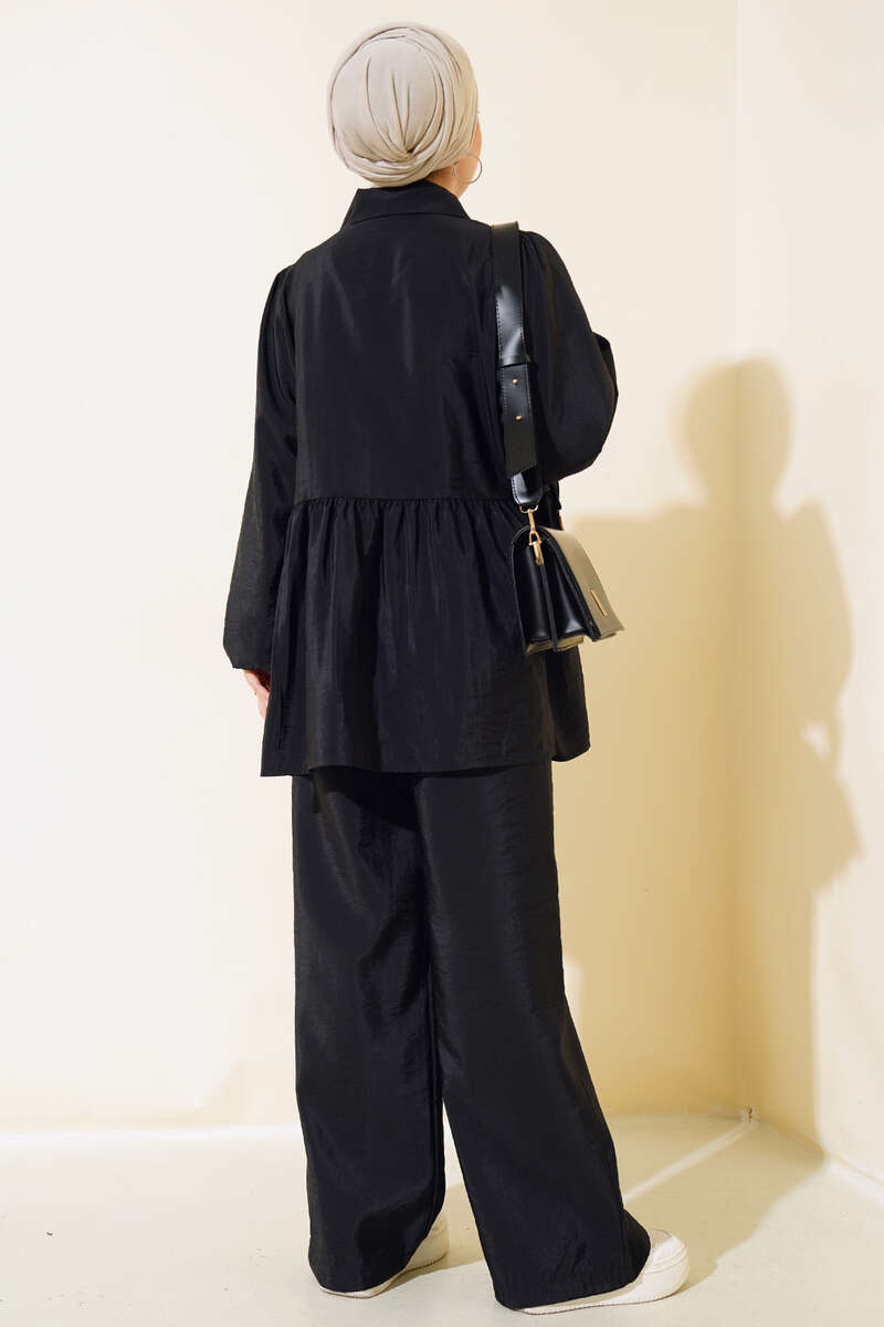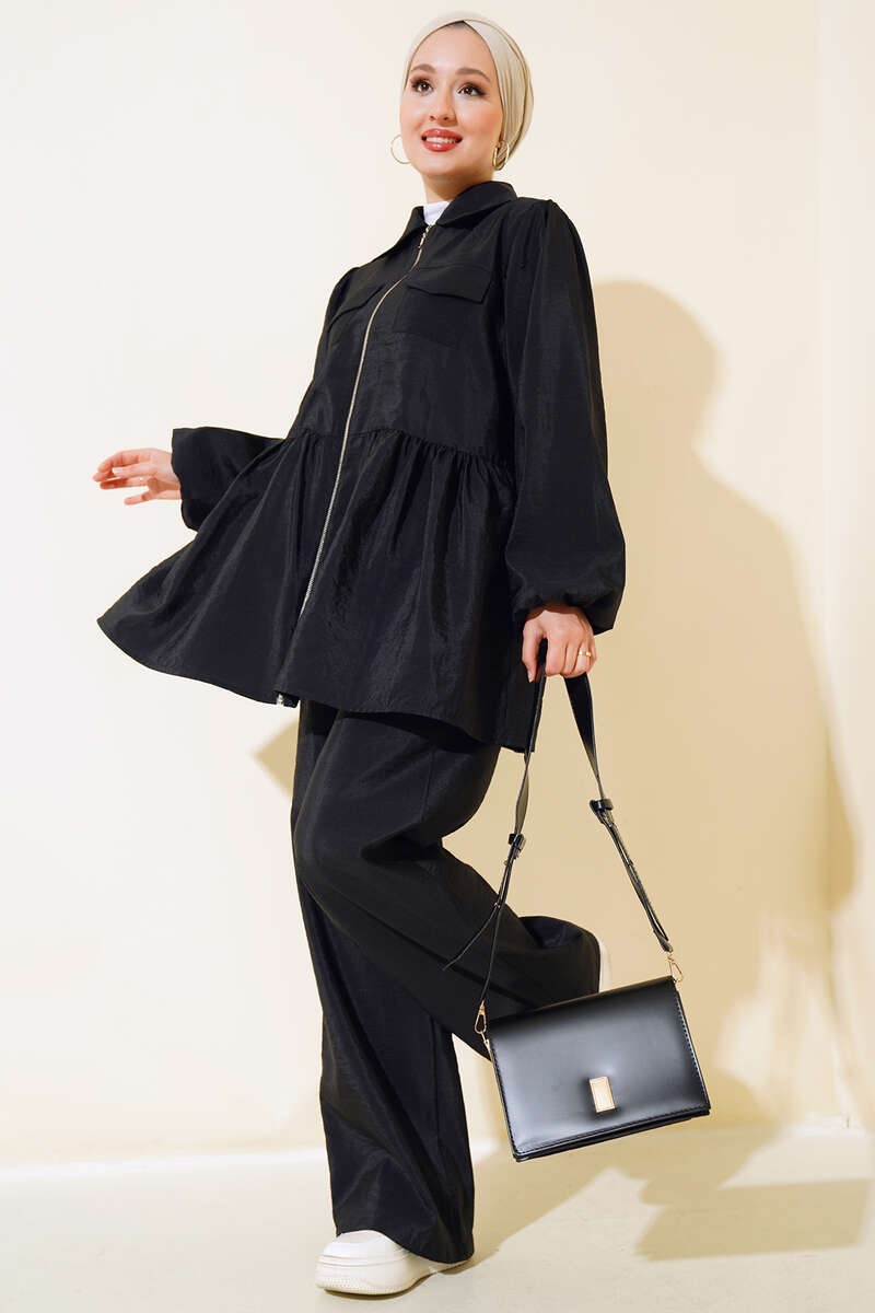Yeni sezon ikili takım modelimiz sizlerle beraber. Tuniğimizin önü boydan fermuarlıdır. Göğsünde iki adet kapaklı cebi vardır. Beli pilelidir. Tuniğimiz gömlek yakadır. Kol bilekleri lastiklidir. Pantolonumuzun beli lastiklidir. Cepsizdir. Geniş paçalıdır. Renk seçenekleri olan ikili takımımız size çok yakışacak.