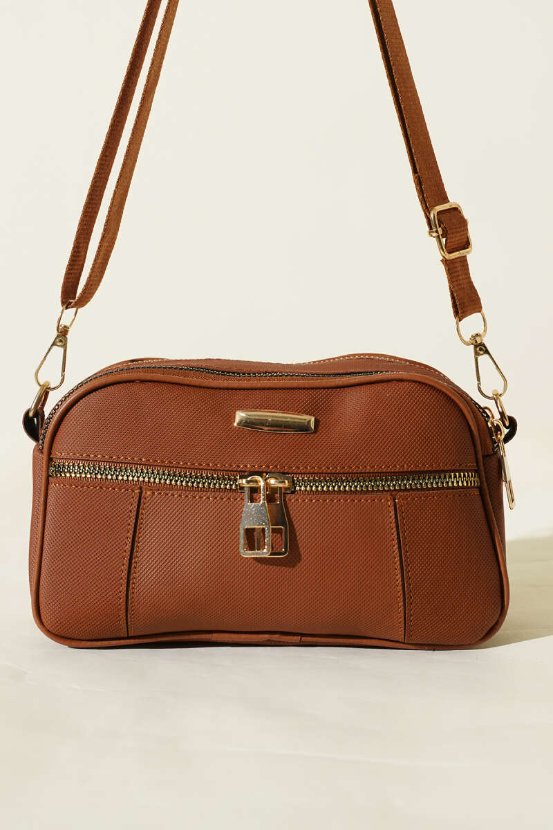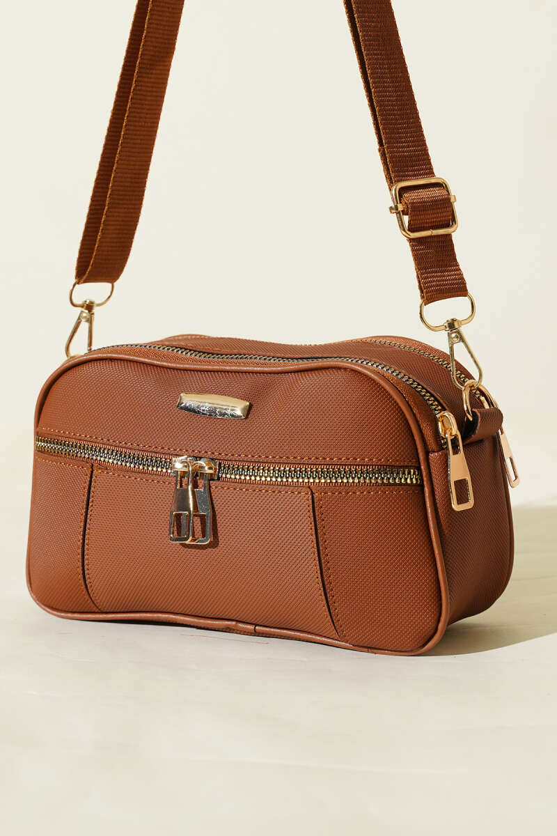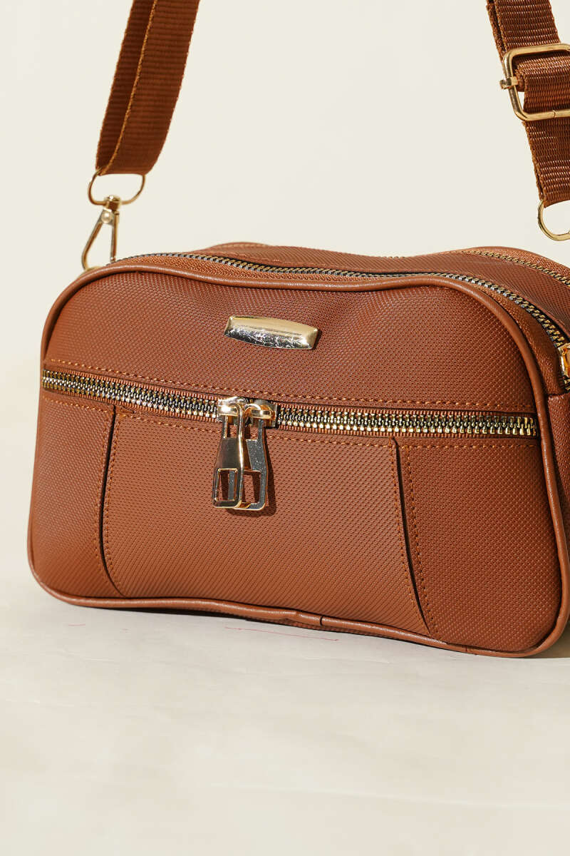 Fermuarlı Üç Bölmeli Çapraz Çanta Bej