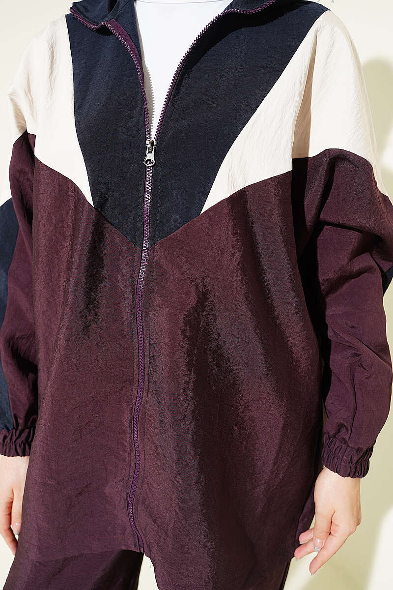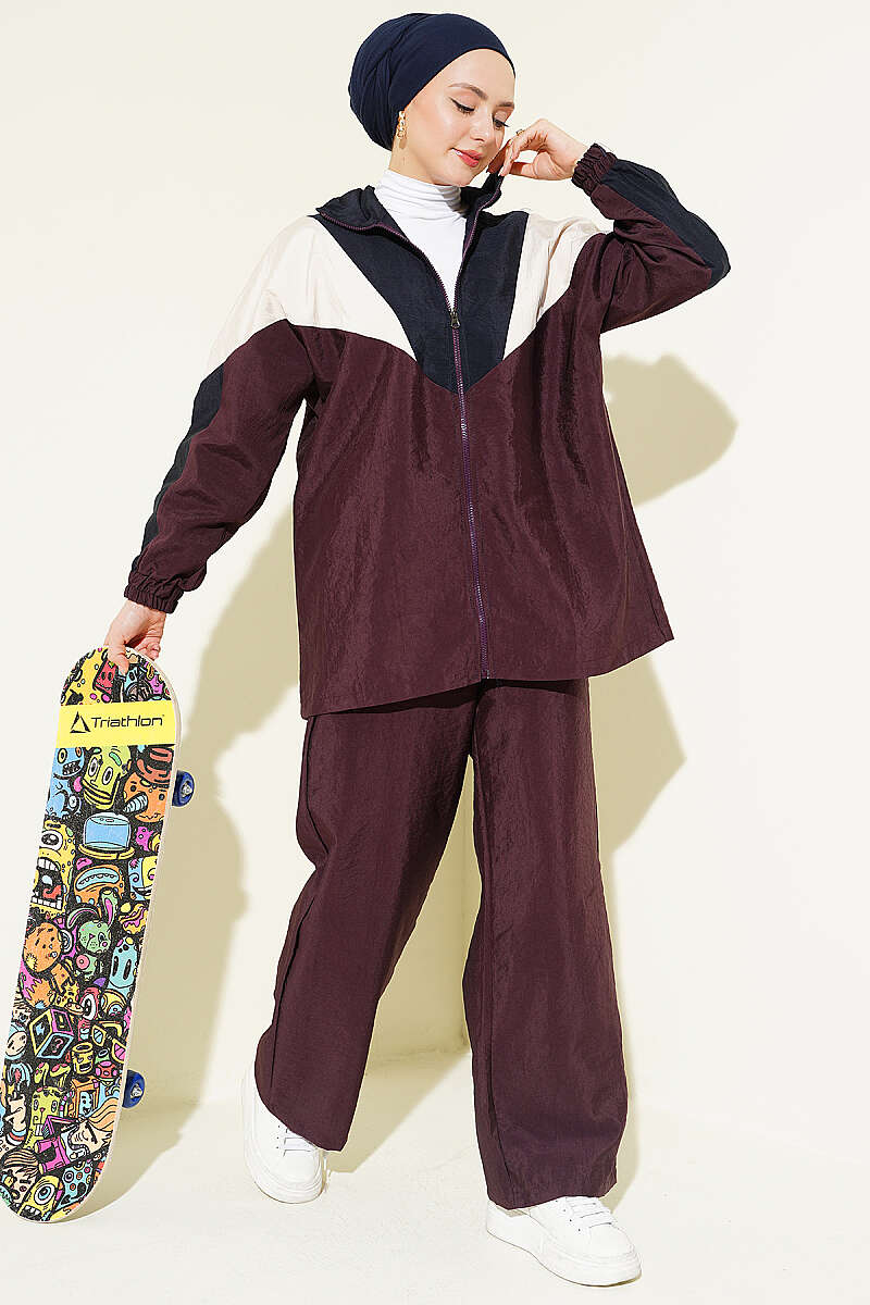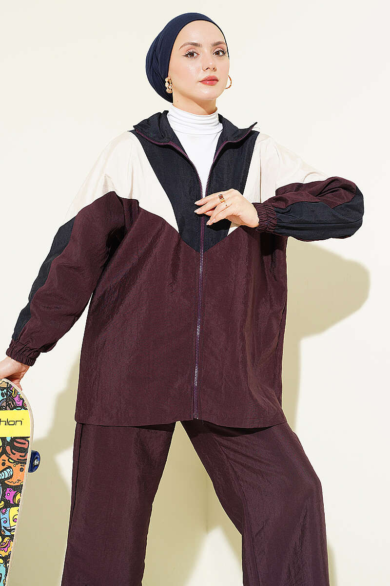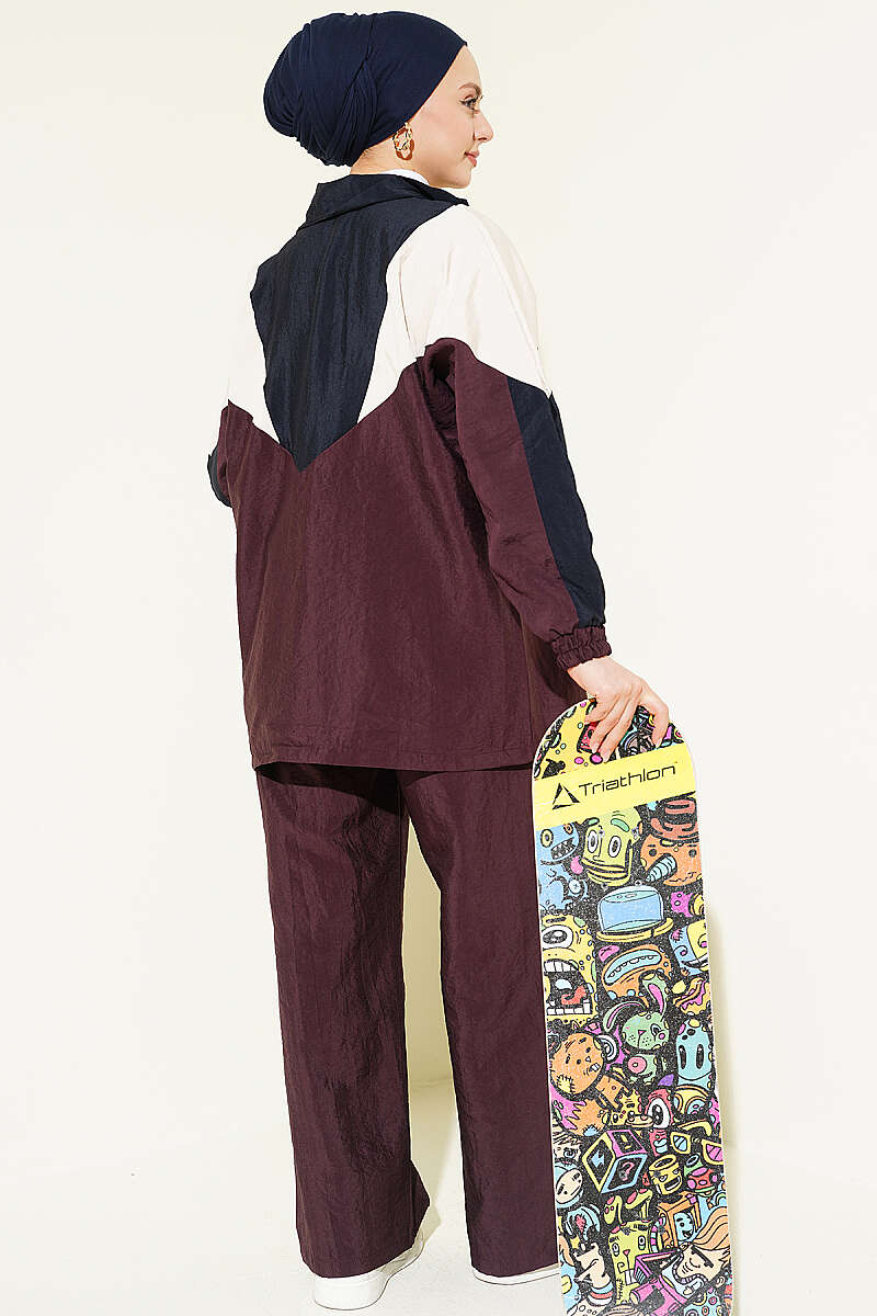 Fermuarlı V Renk Bloklu İkili Takım Burgonya