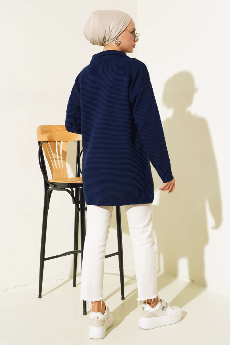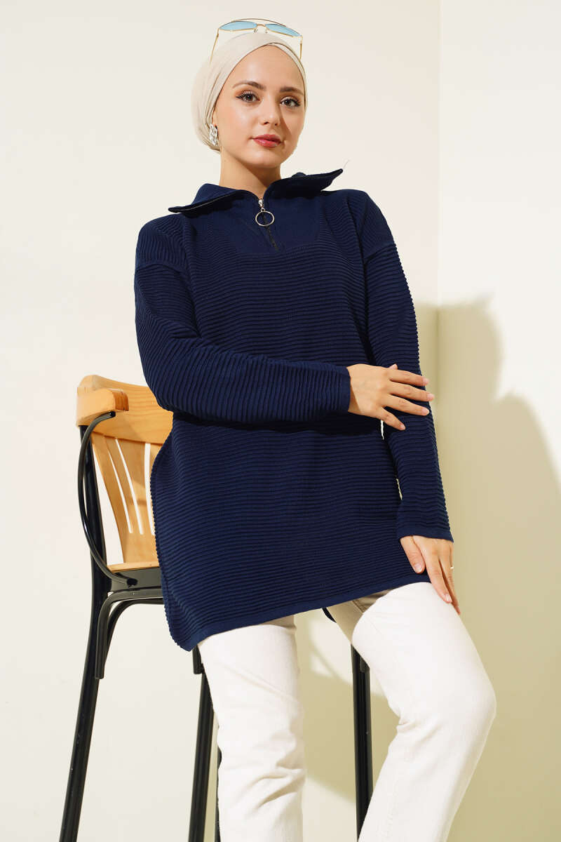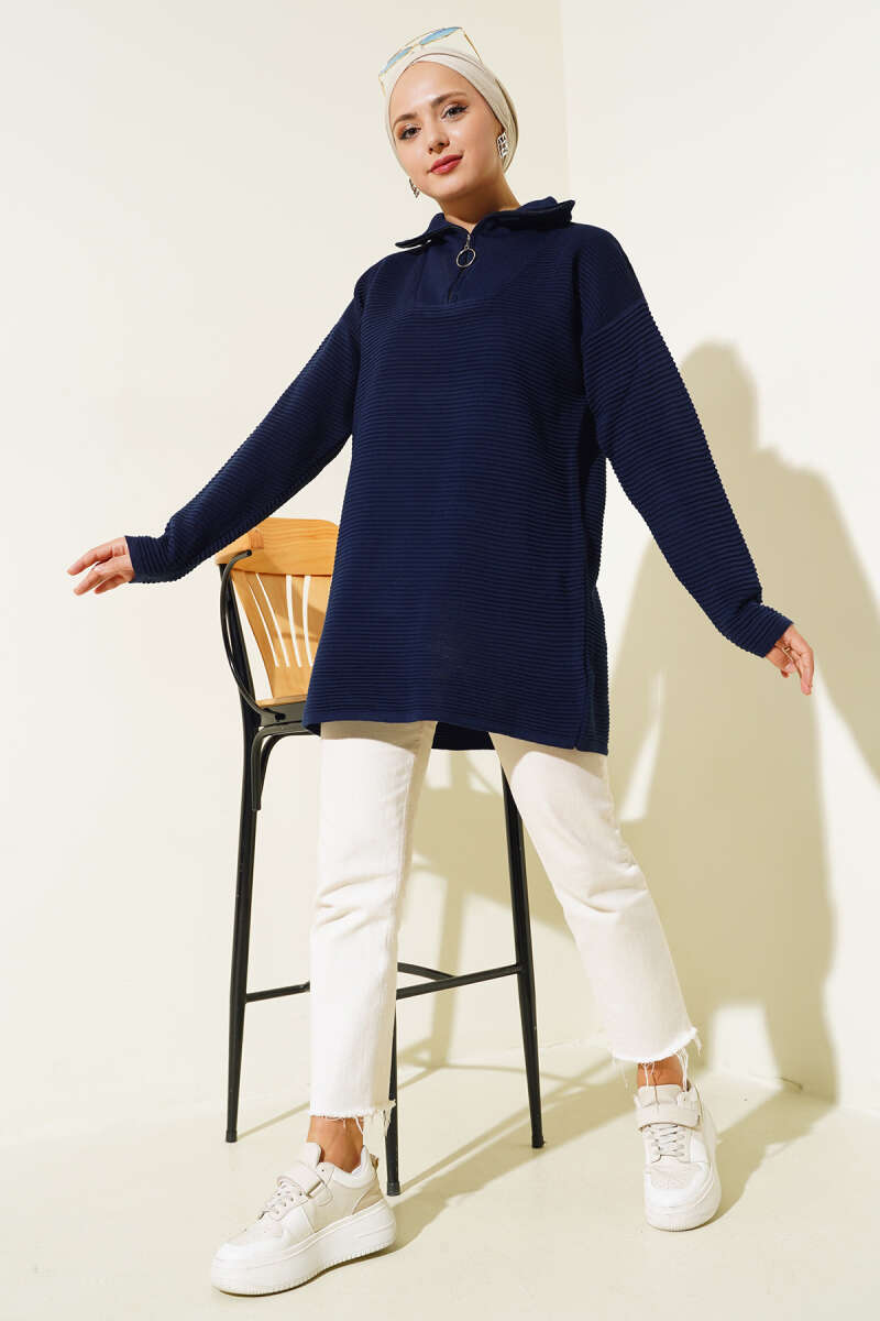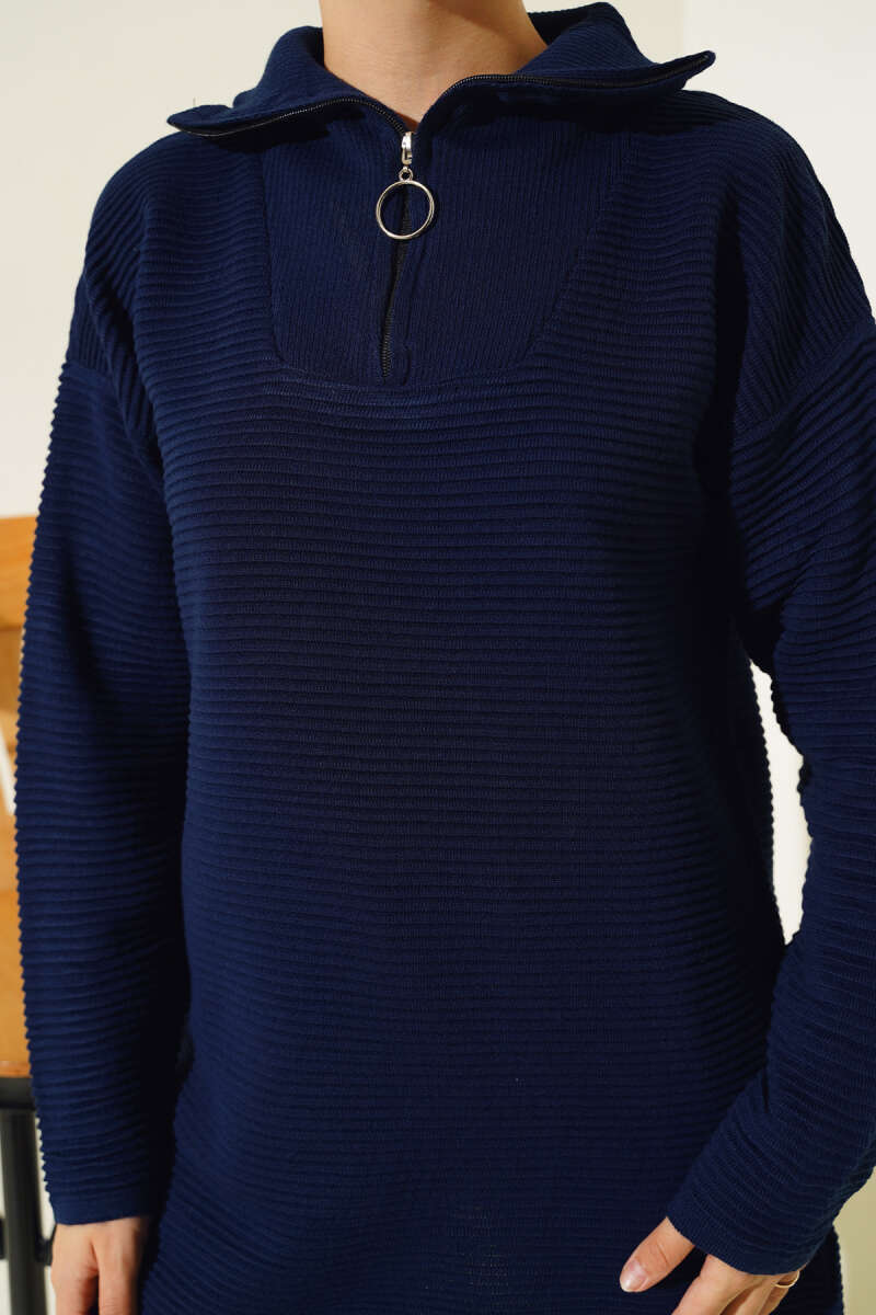 Fermuarlı Yatay Fitilli Triko Tunik Büsküvi