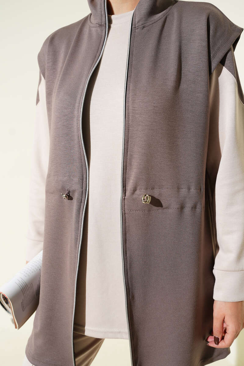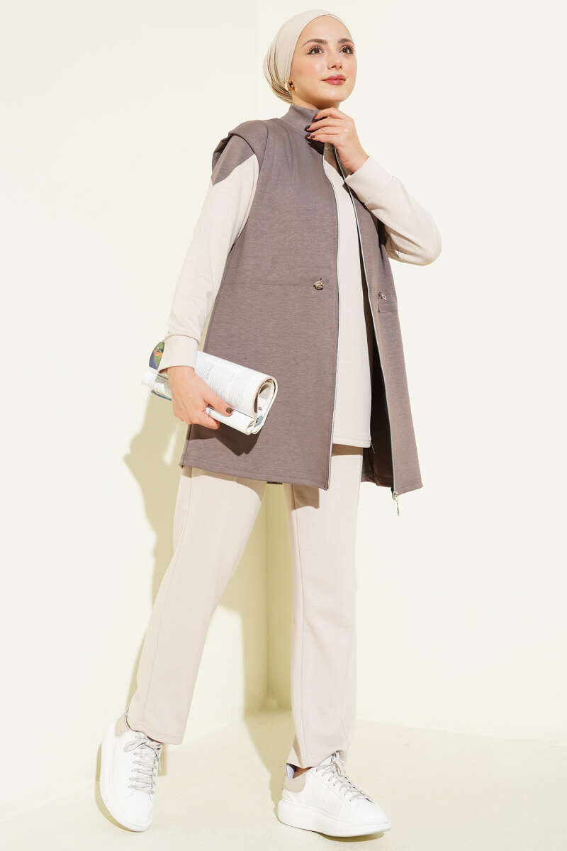 Fermuarlı Yelekli Loyşa Üçlü Takım Vizon