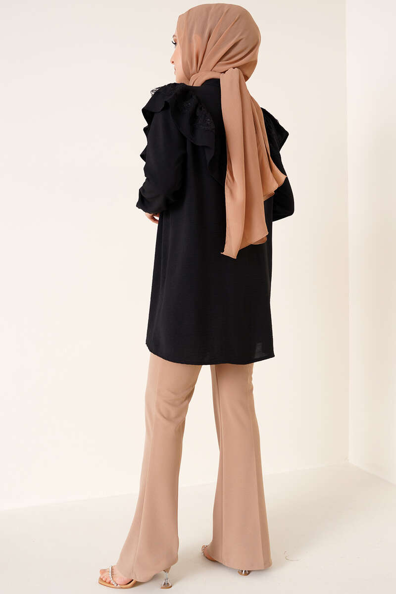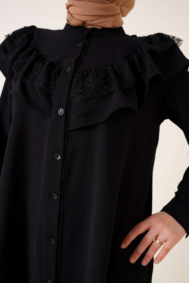 Yeni sezon gömlek göğsünden sıtına doru ilerleyen dantel ve fırfır detayıyla beğenileri toplamakta. Hakim yaka olan gömeleğimizin bilekleri tek düğmeli manşetlidir.