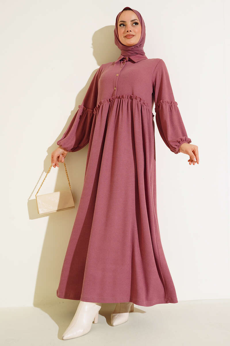 Fırfır Detaylı Burgu Fitilli Elbise Gül Kurusu