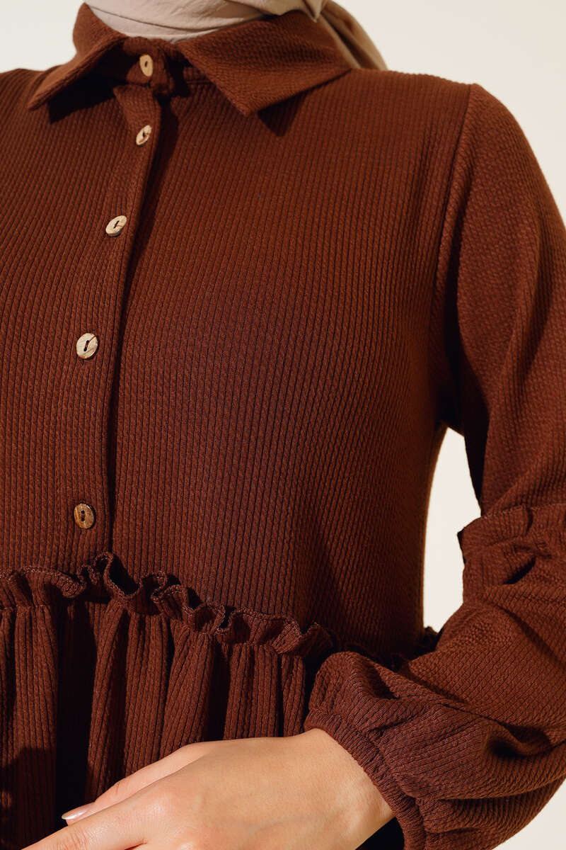 Fırfır Detaylı Burgu Fitilli Elbise Kahve