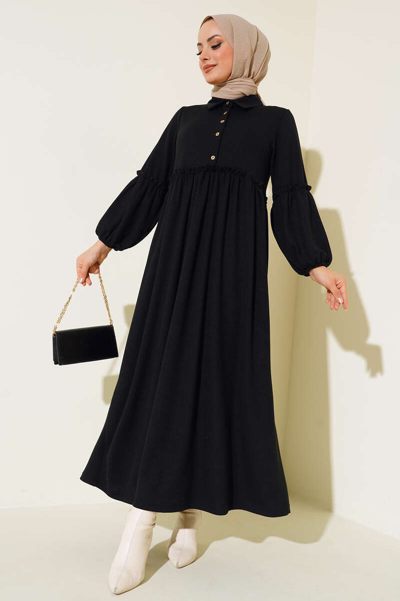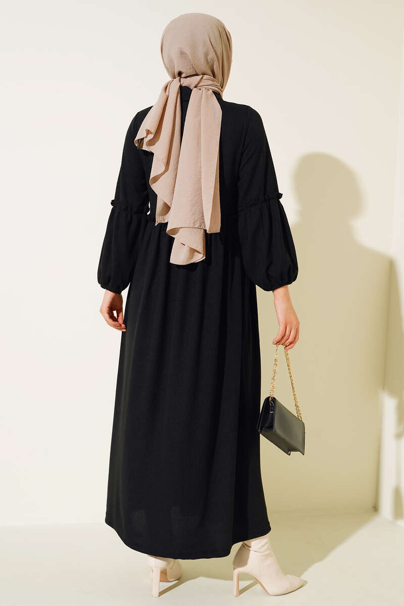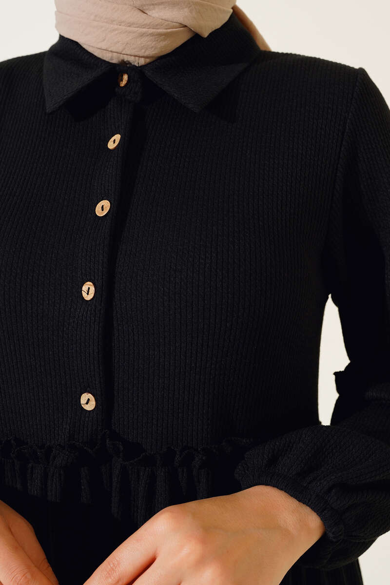 Fırfır Detaylı Burgu Fitilli Elbise Siyah