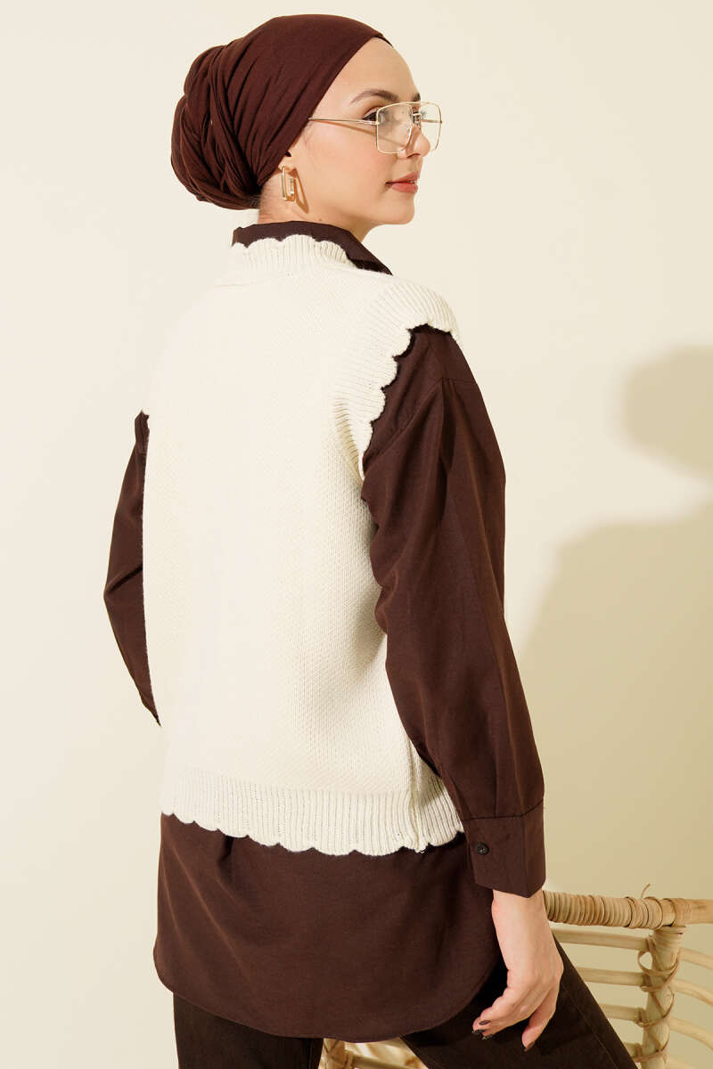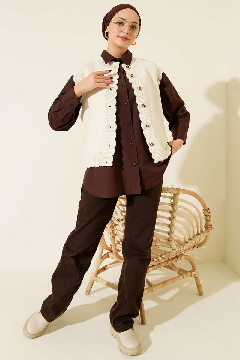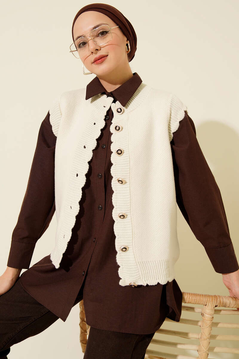 Fırfır Detaylı Düğmeli Triko Yelek Kahve