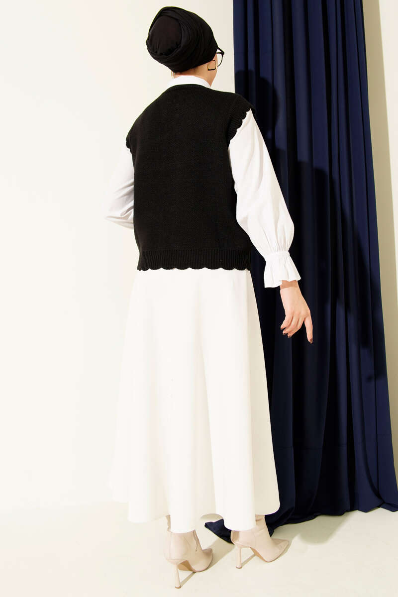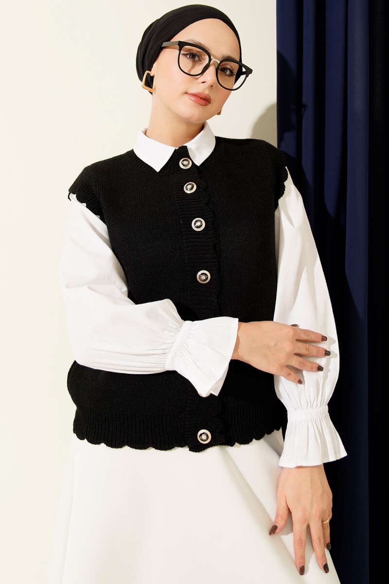 Fırfır Detaylı Düğmeli Triko Yelek Siyah