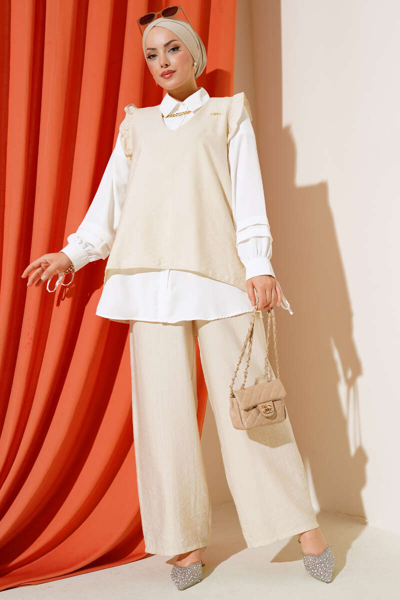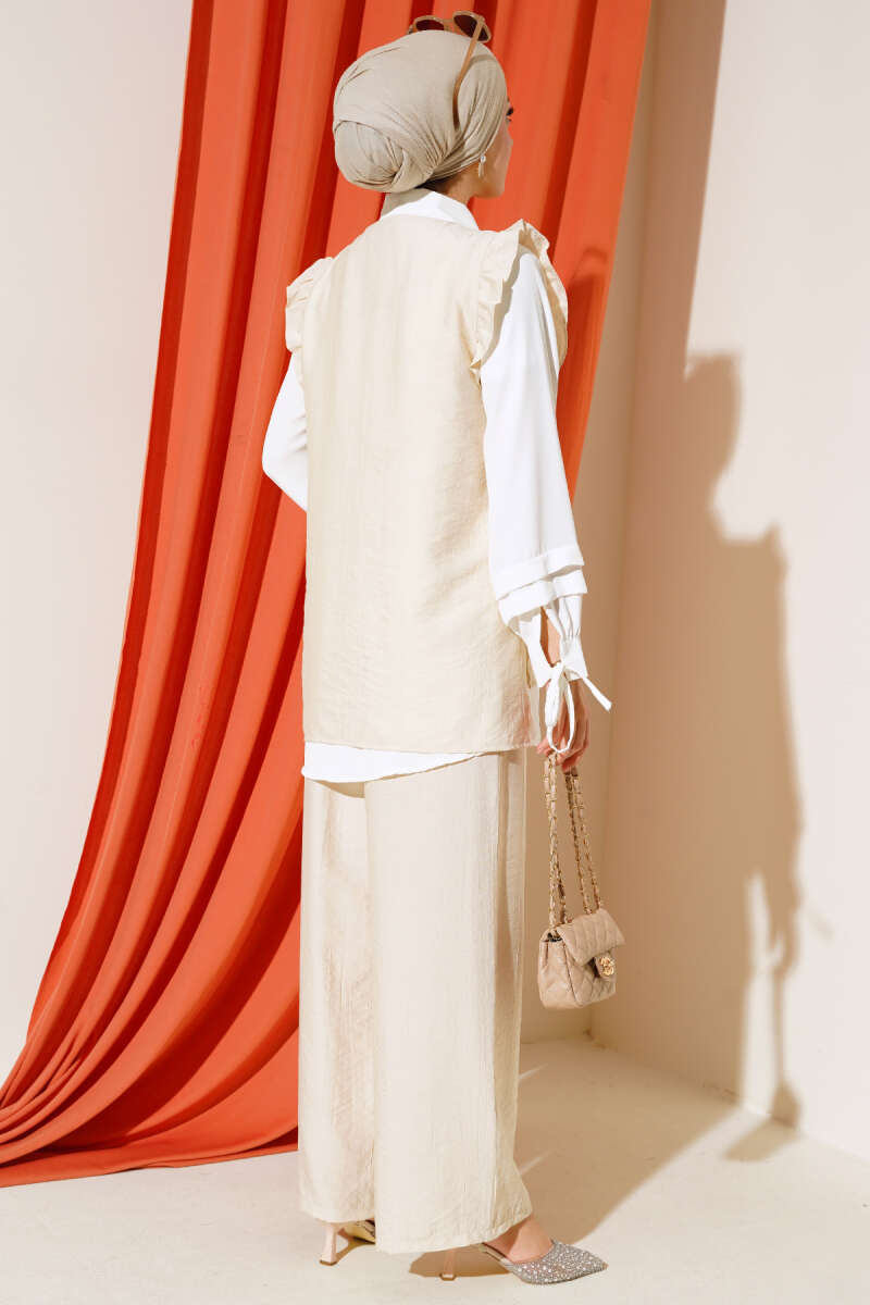 Fırfır Detaylı Üçlü Takım Bej