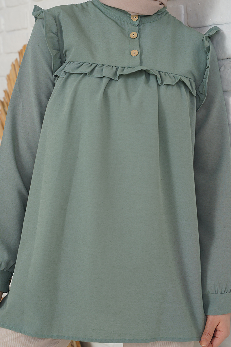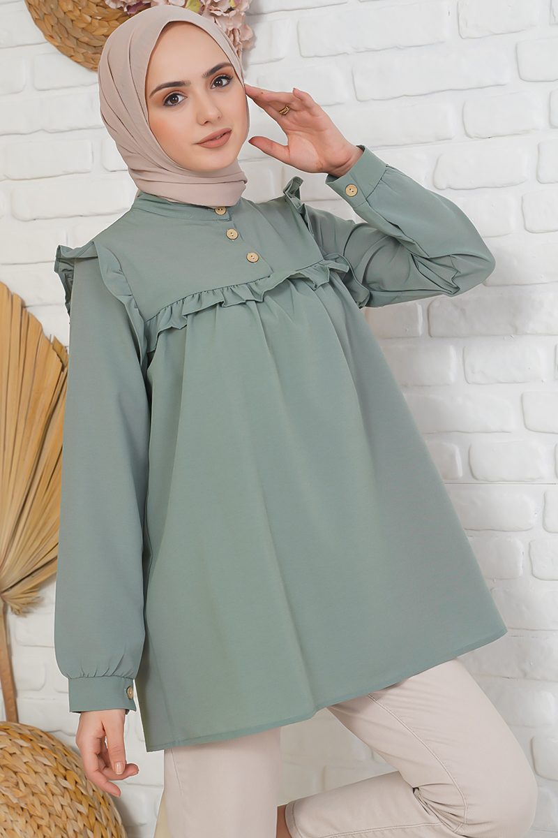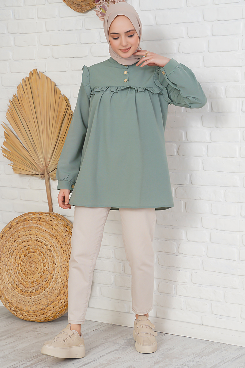 Yeni sezonun en favori tunik modelini kaçırmayın. Yakası düğmeli tuniğimiz çağla yeşili renktir. Fırfır detaylarıyla olduçka şık bir görünüm sunan tuniğimizin kol uçları da düğmelidir.