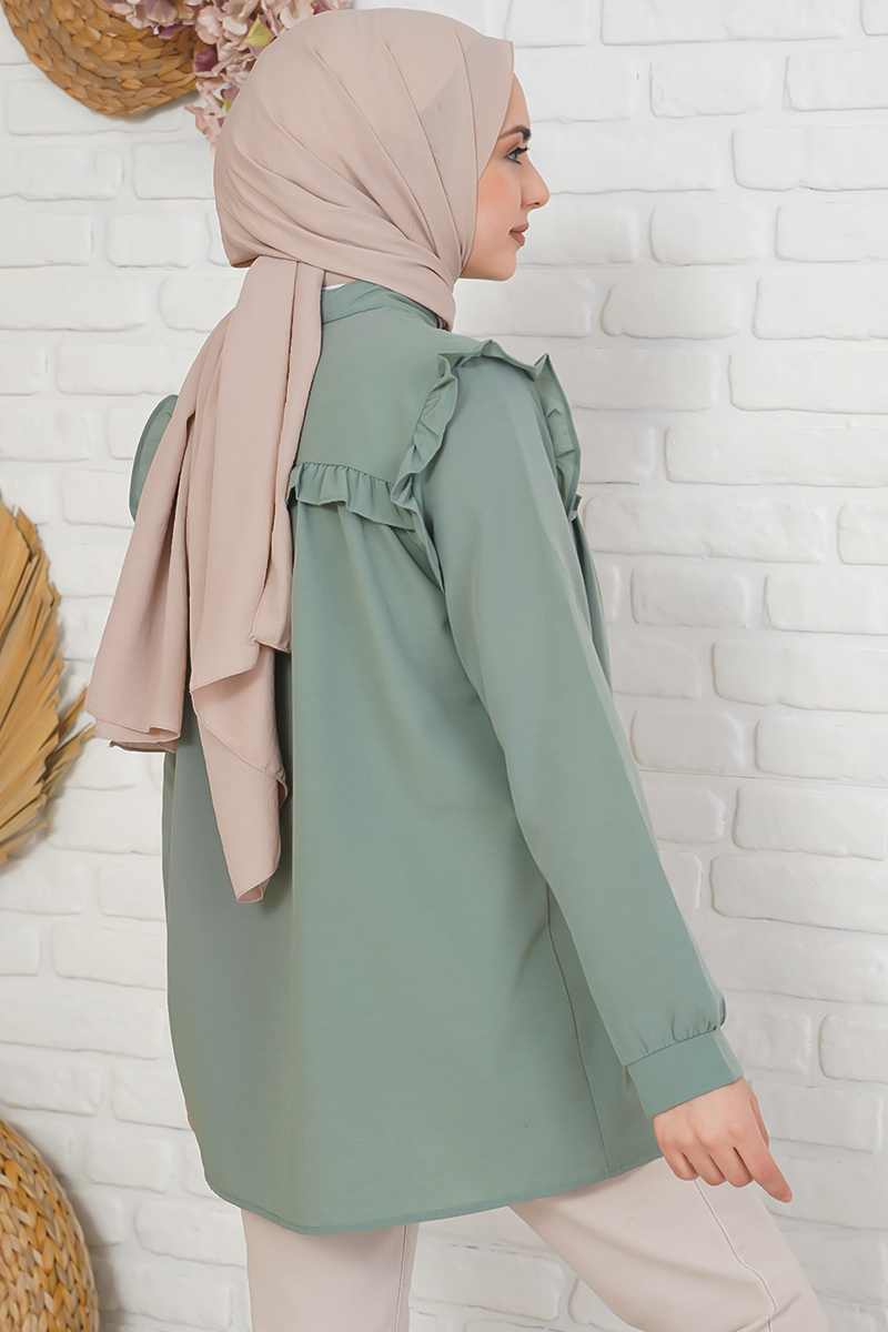 Fırfır Süslemeli Hakim Yaka Çağla Yeşili Tunik
