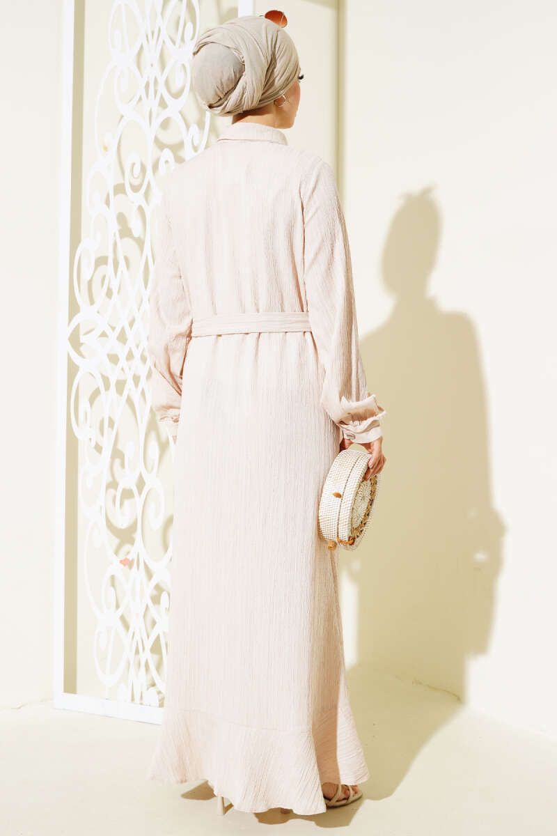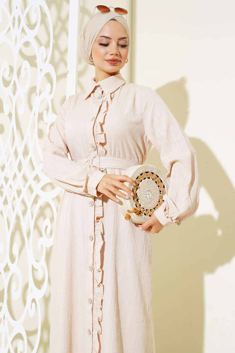 Fırfırlı Boydan Düğmeli Elbise Bej