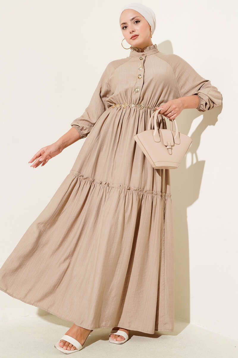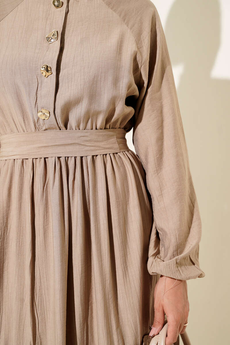 Çift İp Kuşaklı Ekoseli Elbise Bej