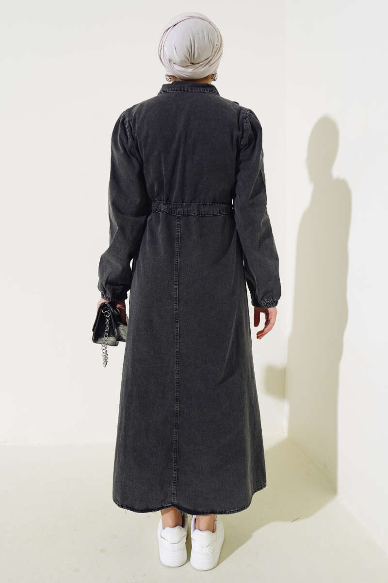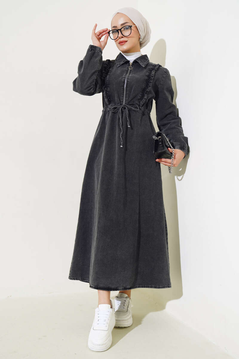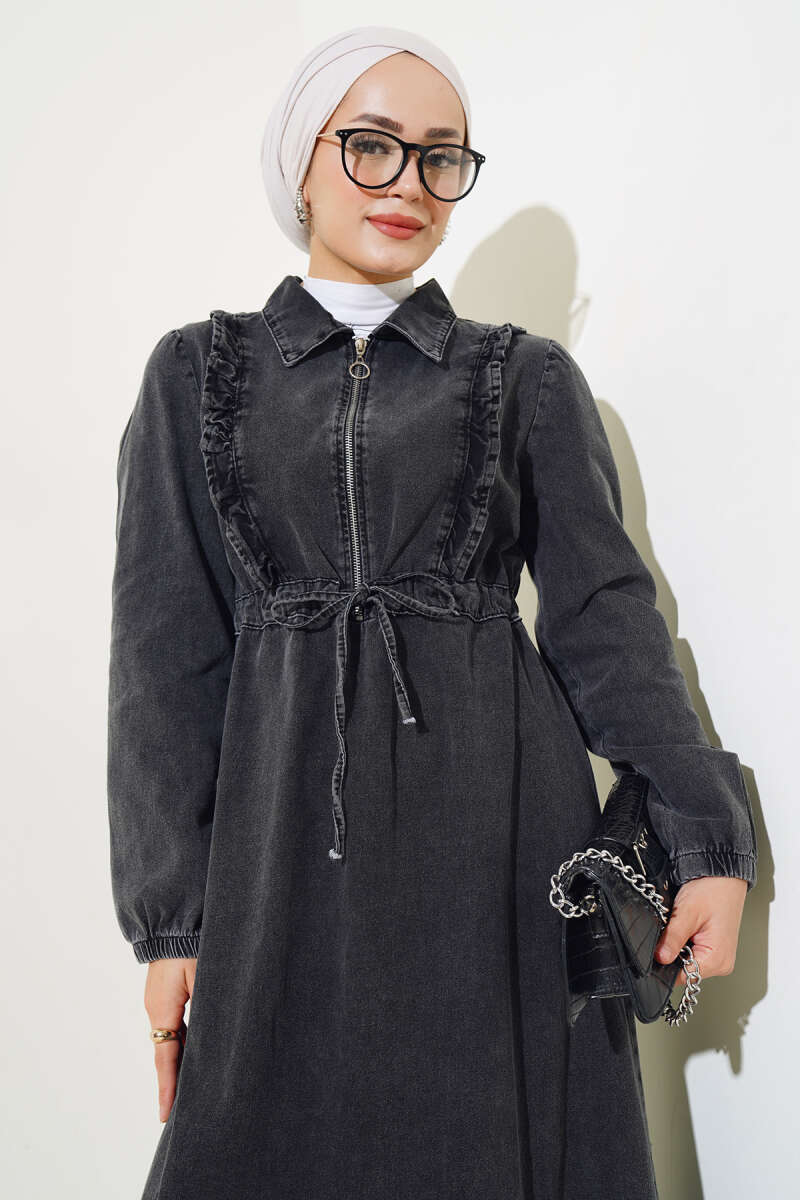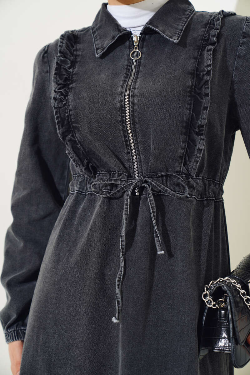 Fırfırlı Fermuarlı Kot Elbise Lacivert
