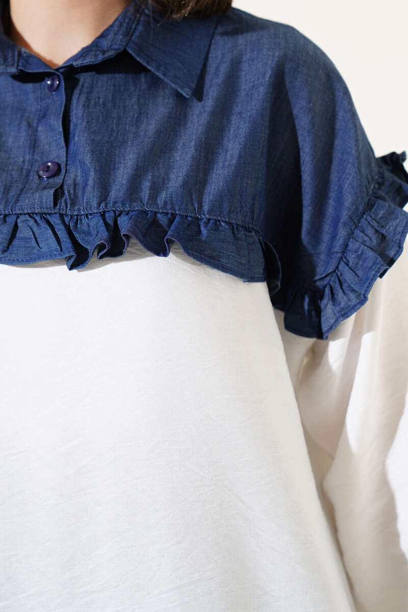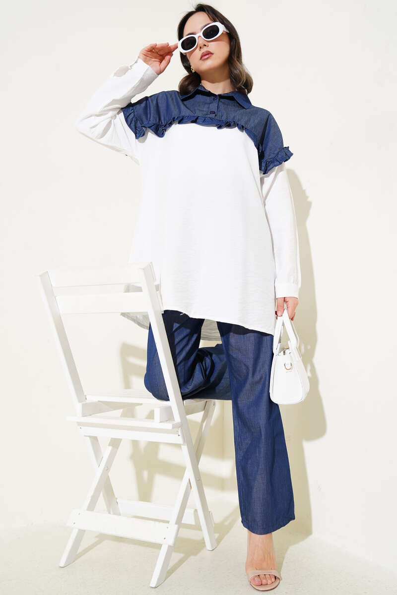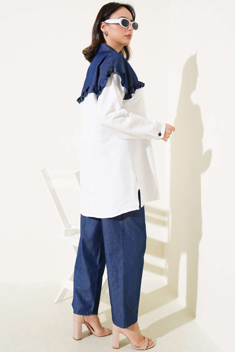 Fırfırlı Garnili Yarım Düğmeli İkili Takım Beyaz