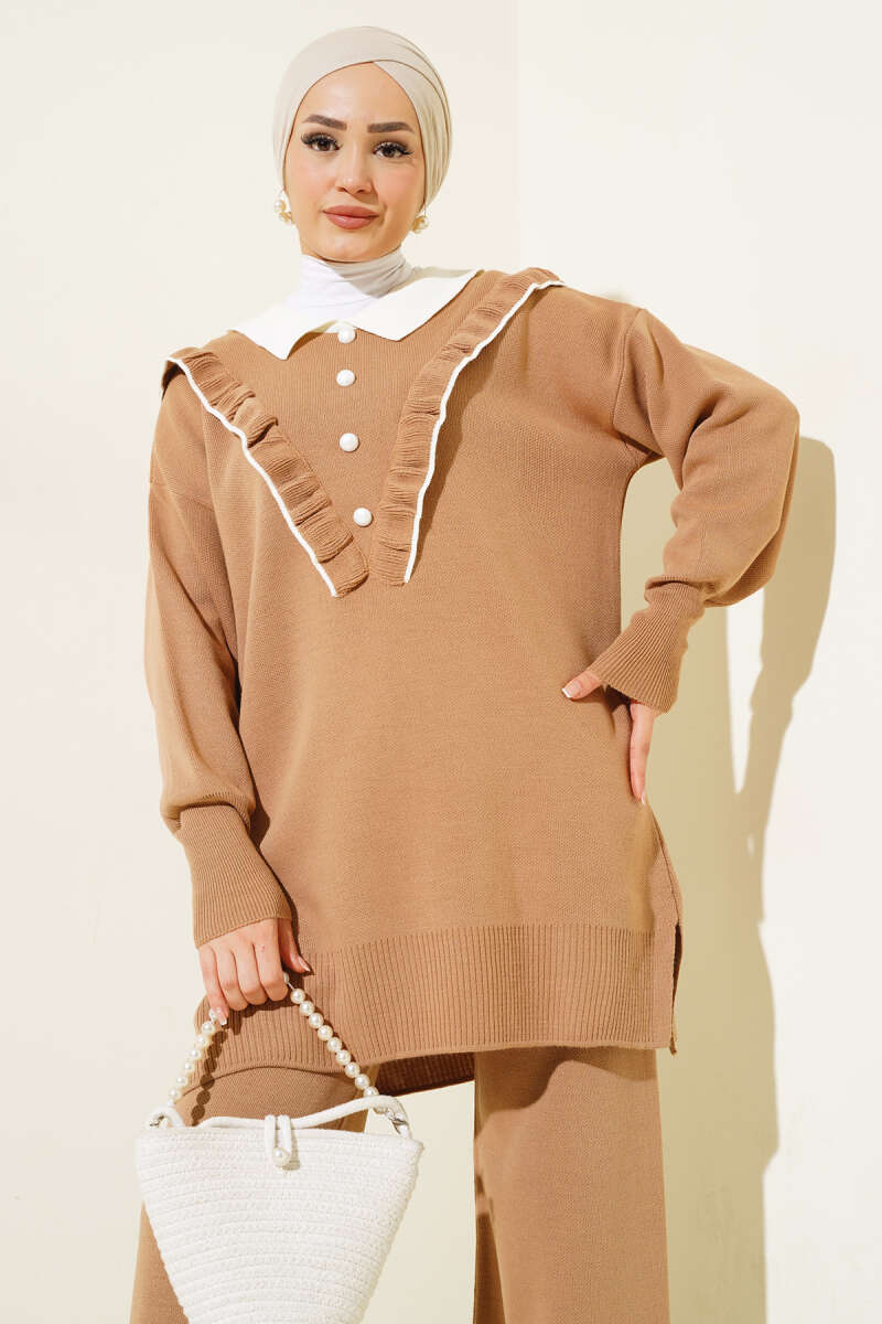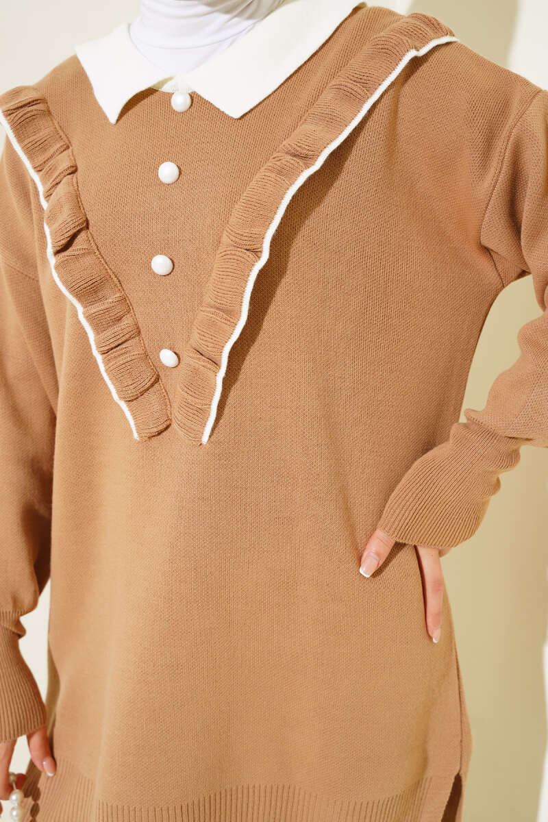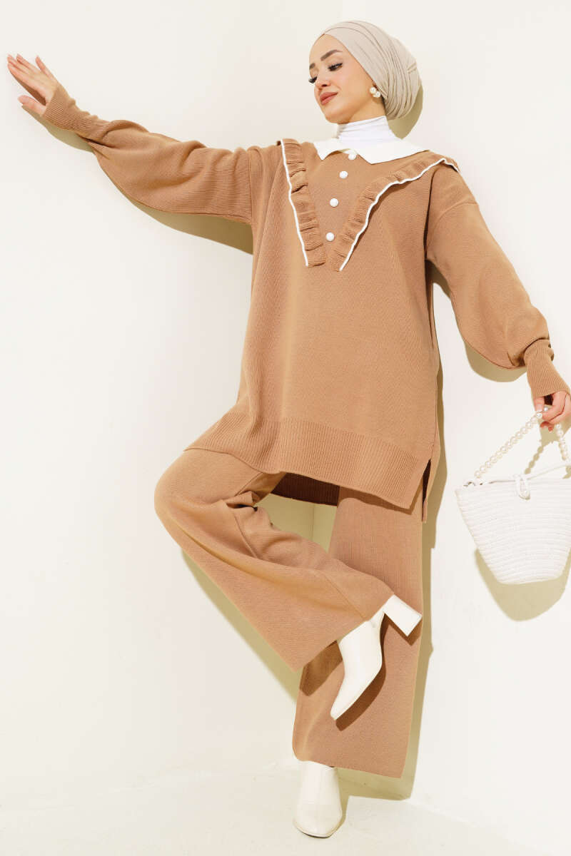 Fırfırlı Gömlek Yaka Triko İkili Takım Kahve