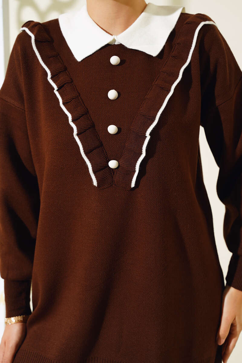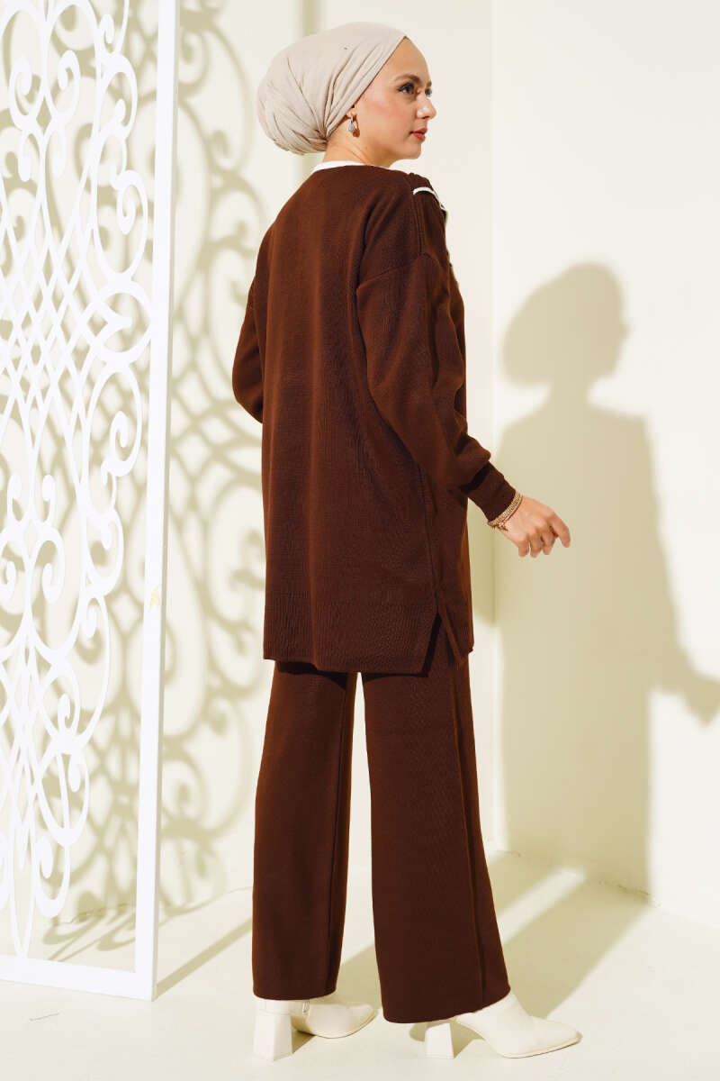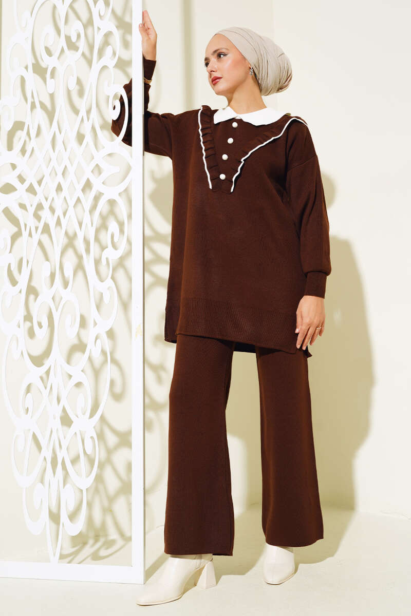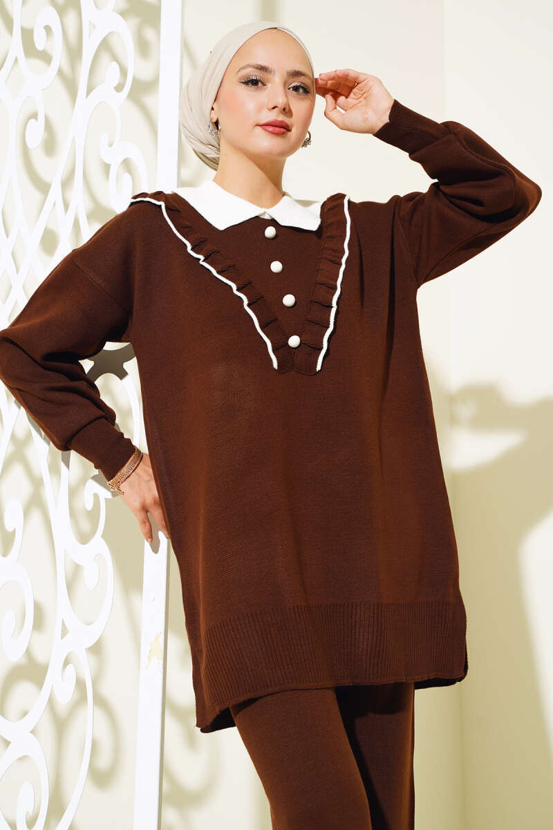 Balon Kol Balıkçı Yaka Triko İkili Takım Kahve