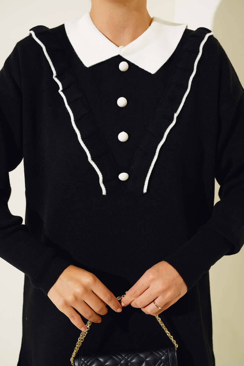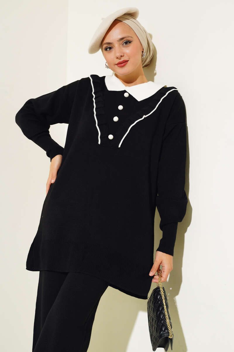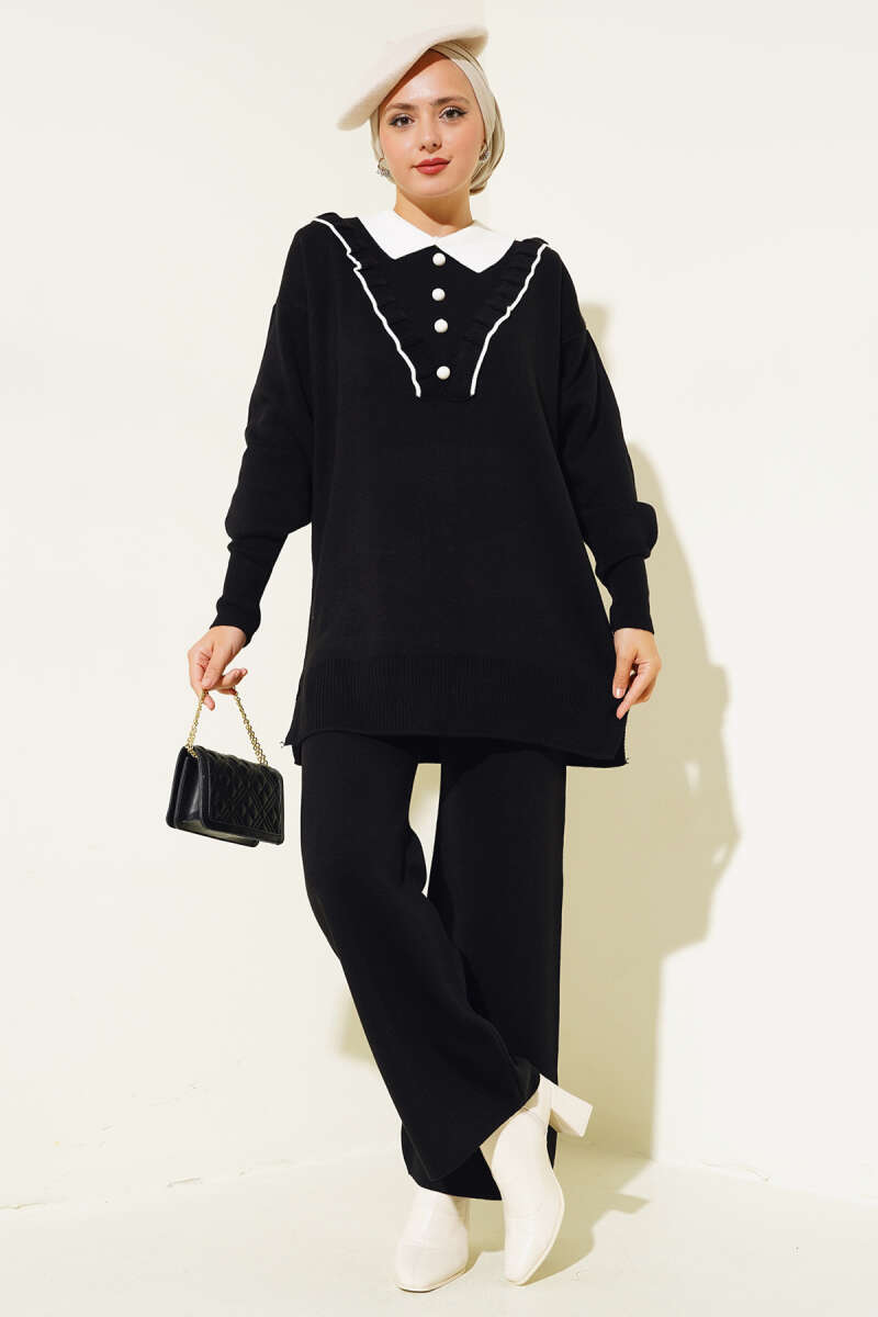 Balon Kol Balıkçı Yaka Triko İkili Takım Siyah