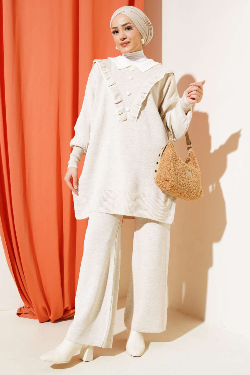 Dikiş Detaylı Basic Triko İkili Takım Bej