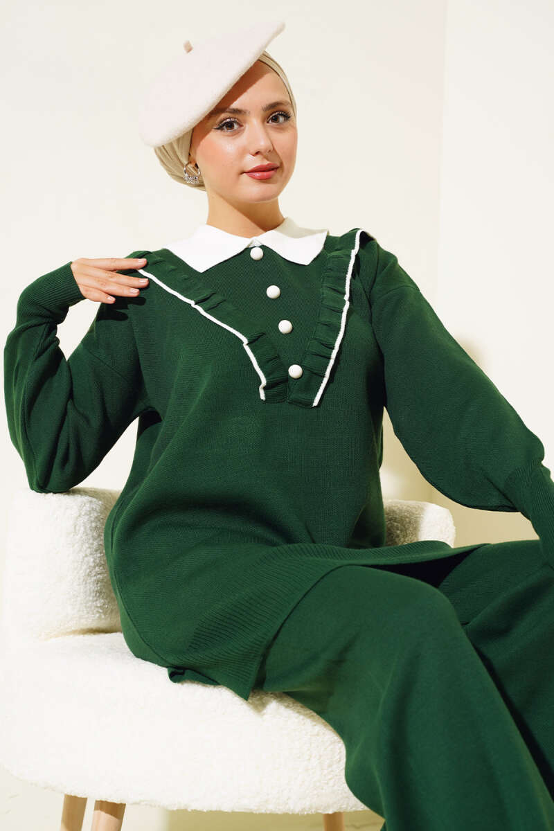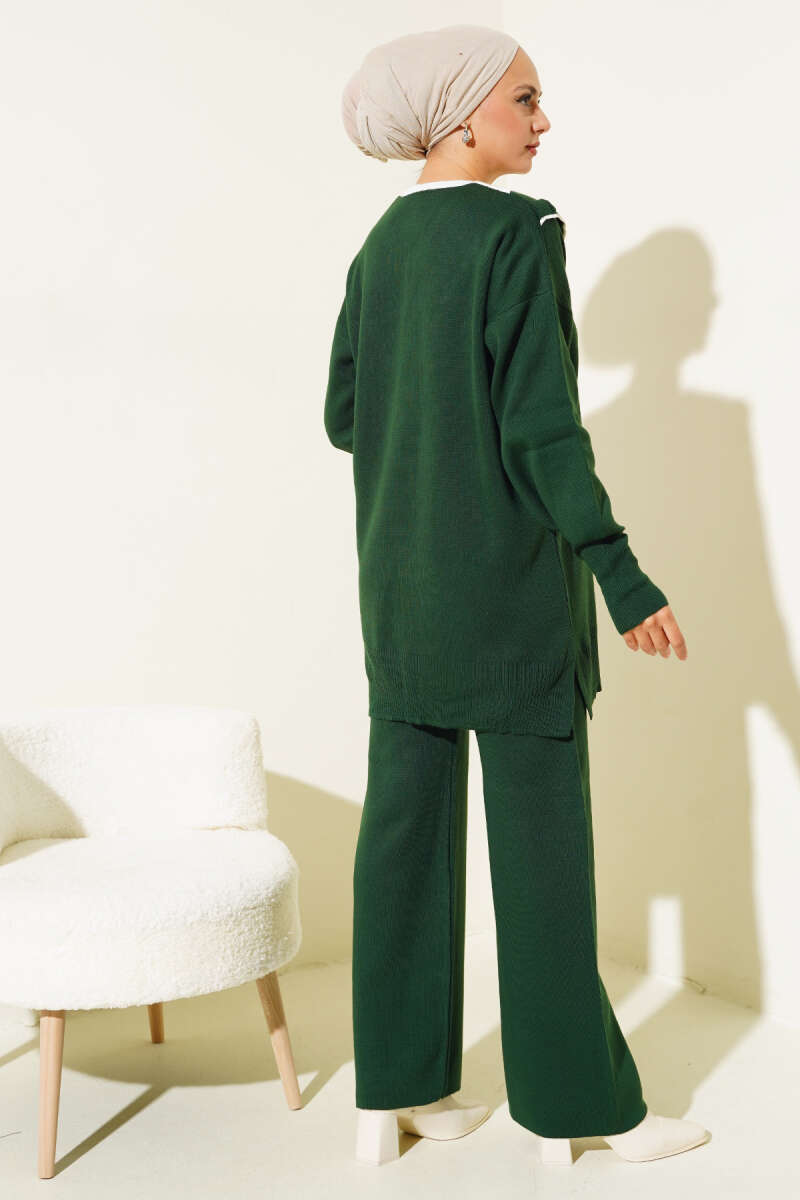 Taşlı Baklava Desen Triko İkili Takım Zümrüt