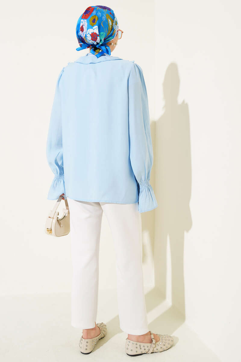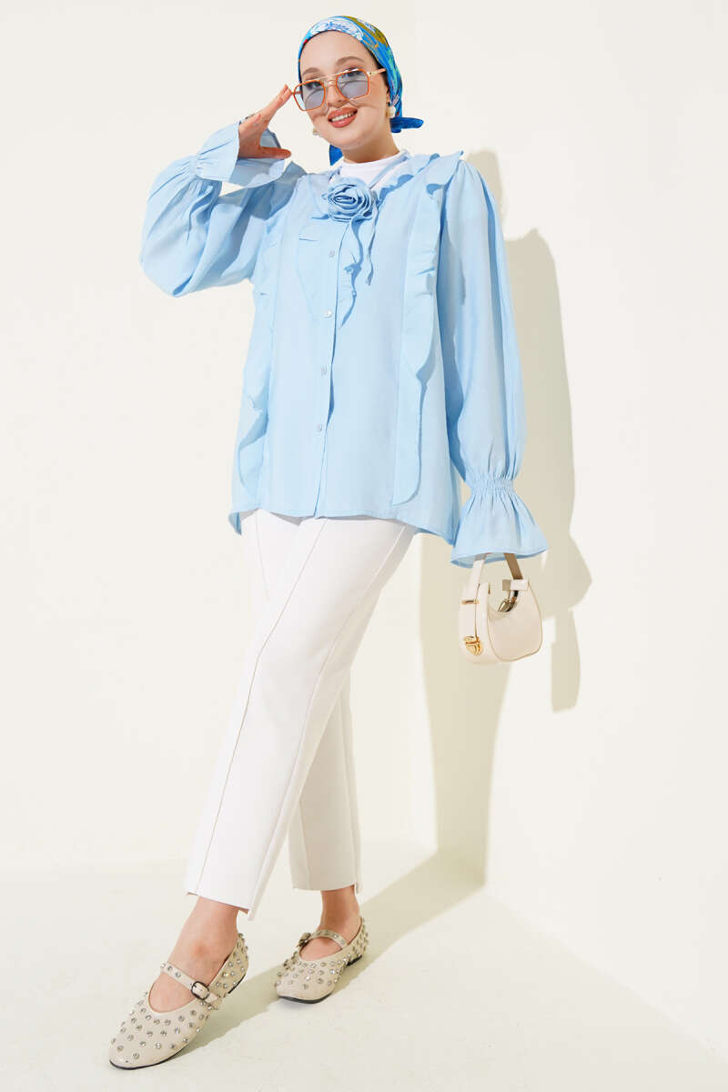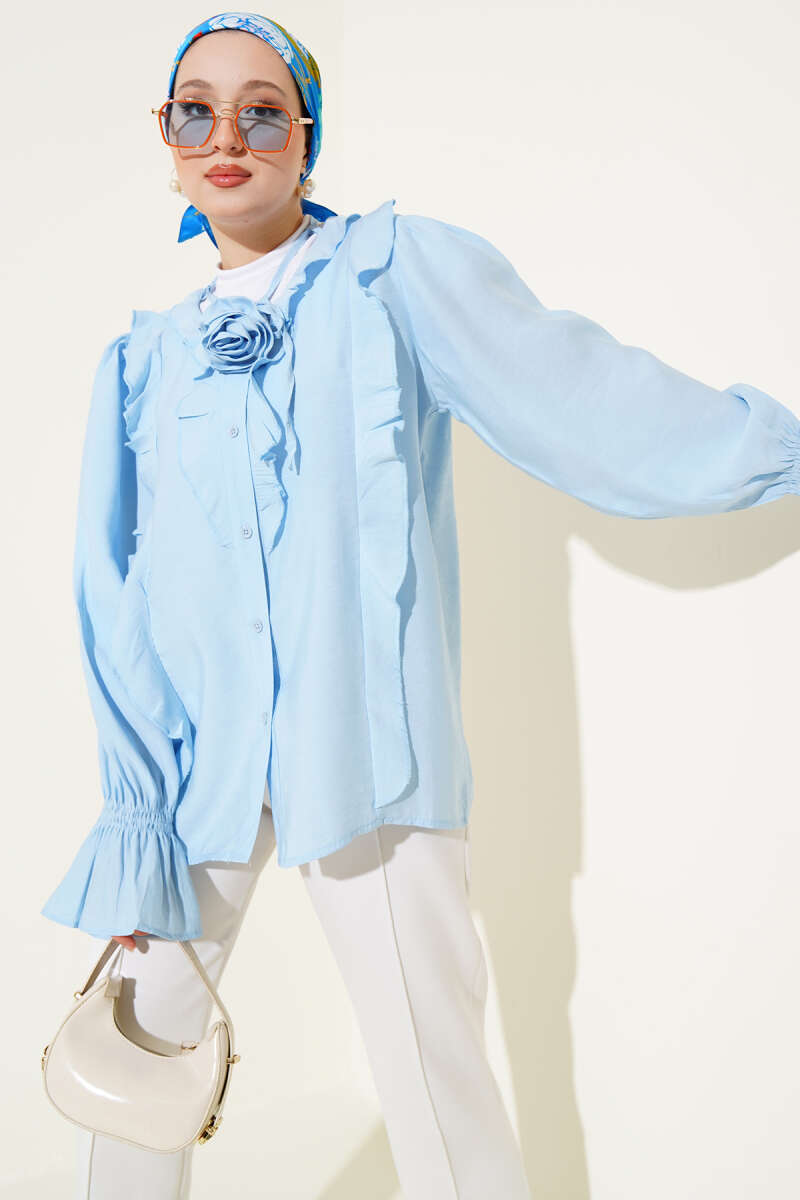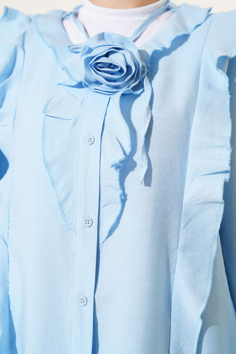 Fırfırlı Gül Aksesuarlı Gömlek Mavi