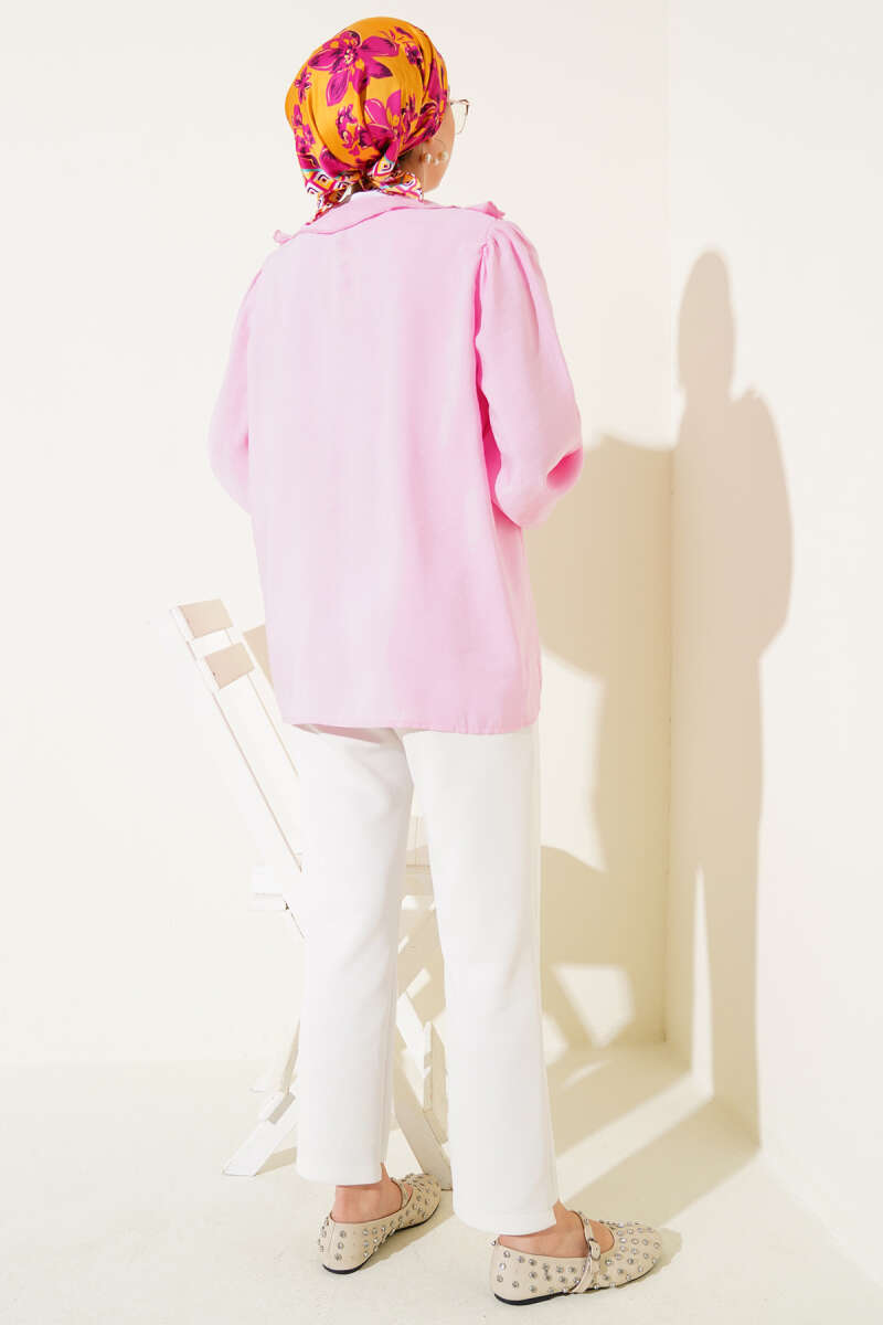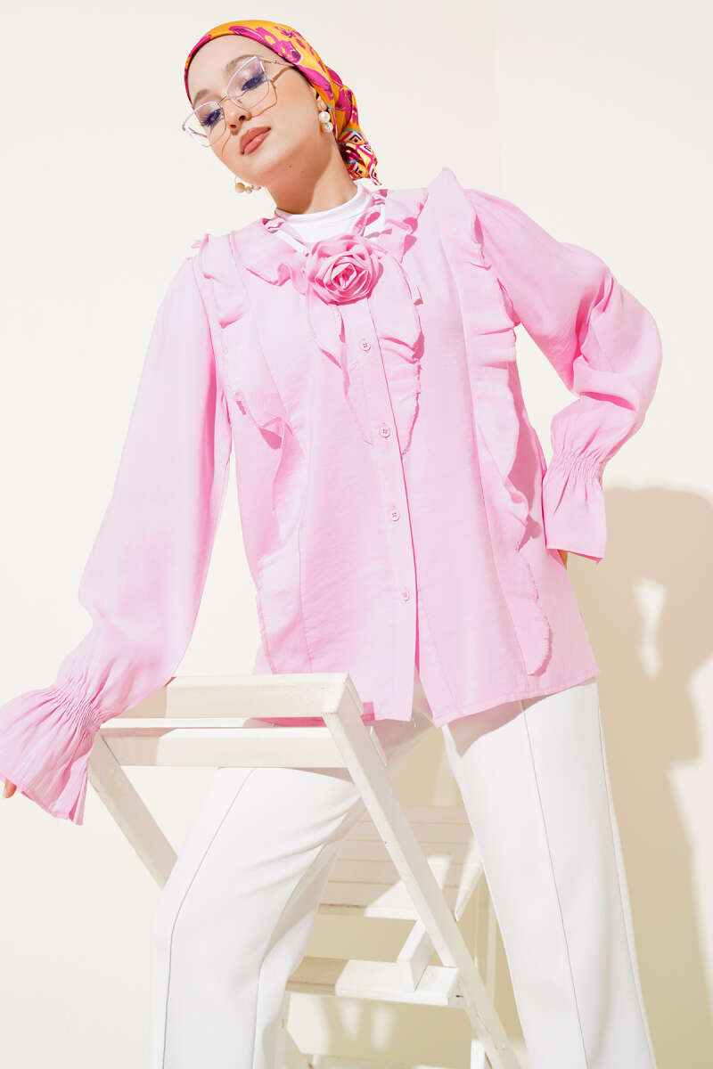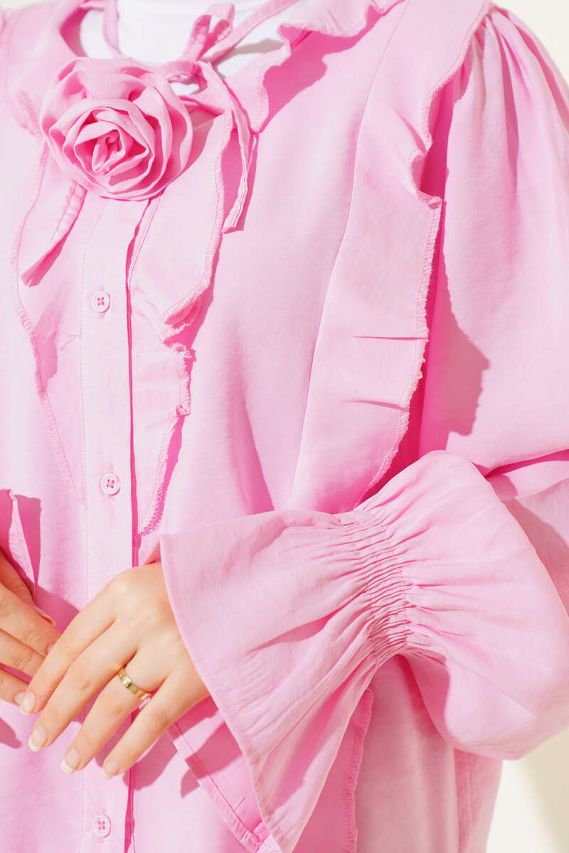 Fırfırlı Gül Aksesuarlı Gömlek Pembe